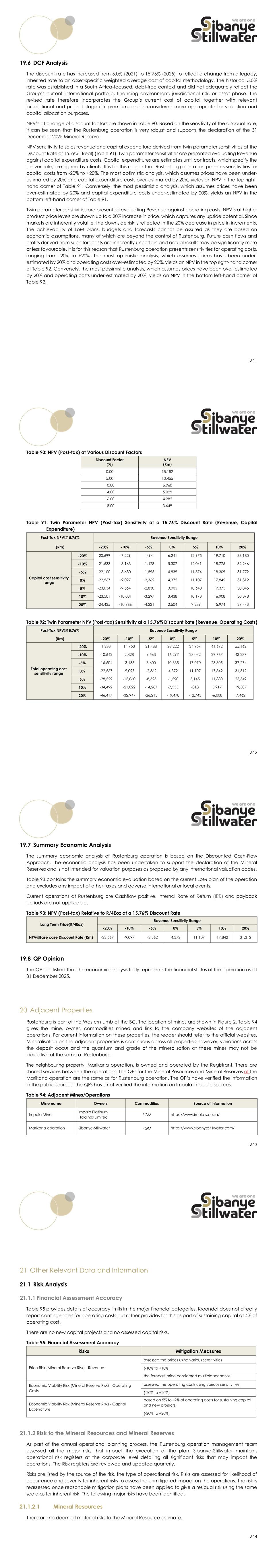 241 19.6 DCF Analysis The discount rate has increased from 5.0% (2021) to 15.76% (2025) to reflect a change from a legacy, inherited rate to an asset-specific weighted average cost of capital methodology. The historical 5.0% rate was established in a South Africa-focused, debt-free context and did not adequately reflect the Group’s current international portfolio, financing environment, jurisdictional risk, or asset phase. The revised rate therefore incorporates the Group’s current cost of capital together with relevant jurisdictional and project-stage risk premiums and is considered more appropriate for valuation and capital allocation purposes. NPV’s at a range of discount factors are shown in Table 90. Based on the sensitivity of the discount rate, it can be seen that the Rustenburg operation is very robust and supports the declaration of the 31 December 2025 Mineral Reserve. NPV sensitivity to sales revenue and capital expenditure derived from twin parameter sensitivities at the Discount Rate of 15.76% (Real) (Table 91). Twin parameter sensitivities are presented evaluating Revenue against capital expenditure costs. Capital expenditures are estimates until contracts, which specify the deliverable, are signed by clients. It is for this reason that Rustenburg operation presents sensitivities for capital costs from -20% to +20%. The most optimistic analysis, which assumes prices have been under- estimated by 20% and capital expenditure costs over-estimated by 20%, yields an NPV in the top right- hand corner of Table 91. Conversely, the most pessimistic analysis, which assumes prices have been over-estimated by 20% and capital expenditure costs under-estimated by 20%, yields an NPV in the bottom left-hand corner of Table 91. Twin parameter sensitivities are presented evaluating Revenue against operating costs. NPV’s at higher product price levels are shown up to a 20% increase in price, which captures any upside potential. Since markets are inherently volatile, the downside risk is reflected in the 20% decrease in price in increments. The achievability of LoM plans, budgets and forecasts cannot be assured as they are based on economic assumptions, many of which are beyond the control of Rustenburg. Future cash flows and profits derived from such forecasts are inherently uncertain and actual results may be significantly more or less favourable. It is for this reason that Rustenburg operation presents sensitivities for operating costs, ranging from -20% to +20%. The most optimistic analysis, which assumes prices have been under- estimated by 20% and operating costs over-estimated by 20%, yields an NPV in the top right-hand corner of Table 92. Conversely, the most pessimistic analysis, which assumes prices have been over-estimated by 20% and operating costs under-estimated by 20%, yields an NPV in the bottom left-hand corner of Table 92. 242 Table 90: NPV (Post-tax) at Various Discount Factors Discount Factor (%) NPV (Rm) 0.00 15,182 5.00 10,455 10.00 6,960 14.00 5,029 16.00 4,282 18.00 3,649 Table 91: Twin Parameter NPV (Post-tax) Sensitivity at a 15.76% Discount Rate (Revenue, Capital Expenditure) Post-Tax NPV@15.76% Revenue Sensitivity Range (Rm) -20% -10% -5% 0% 5% 10% 20% Capital cost sensitivity range -20% -20,699 -7,229 -494 6,241 12,975 19,710 33,180 -10% -21,633 -8,163 -1,428 5,307 12,041 18,776 32,246 -5% -22,100 -8,630 -1,895 4,839 11,574 18,309 31,779 0% -22,567 -9,097 -2,362 4,372 11,107 17,842 31,312 5% -23,034 -9,564 -2,830 3,905 10,640 17,375 30,845 10% -23,501 -10,031 -3,297 3,438 10,173 16,908 30,378 20% -24,435 -10,966 -4,231 2,504 9,239 15,974 29,443 Table 92: Twin Parameter NPV (Post-tax) Sensitivity at a 15.76% Discount Rate (Revenue, Operating Costs) Post-Tax NPV@15.76% Revenue Sensitivity Range (Rm) -20% -10% -5% 0% 5% 10% 20% Total operating cost sensitivity range -20% 1,283 14,753 21,488 28,222 34,957 41,692 55,162 -10% -10,642 2,828 9,563 16,297 23,032 29,767 43,237 -5% -16,604 -3,135 3,600 10,335 17,070 23,805 37,274 0% -22,567 -9,097 -2,362 4,372 11,107 17,842 31,312 5% -28,529 -15,060 -8,325 -1,590 5,145 11,880 25,349 10% -34,492 -21,022 -14,287 -7,553 -818 5,917 19,387 20% -46,417 -32,947 -26,213 -19,478 -12,743 -6,008 7,462 243 19.7 Summary Economic Analysis The summary economic analysis of Rustenburg operation is based on the Discounted Cash-Flow Approach. The economic analysis has been undertaken to support the declaration of the Mineral Reserves and is not intended for valuation purposes as proposed by any international valuation codes. Table 93 contains the summary economic evaluation based on the current LoM plan of the operation and excludes any impact of other taxes and adverse international or local events. Current operations at Rustenburg are Cashflow positive. Internal Rate of Return (IRR) and payback periods are not applicable. Table 93: NPV (Post-tax) Relative to R/4Eoz at a 15.76% Discount Rate Long Term Price(R/4Eoz) Revenue Sensitivity Range -20% -10% -5% 0% 5% 10% 20% NPV@Base case Discount Rate (Rm) -22,567 -9,097 -2,362 4,372 11,107 17,842 31,312 19.8 QP Opinion The QP is satisfied that the economic analysis fairly represents the financial status of the operation as at 31 December 2025. 20 Adjacent Properties Rustenburg is part of the Western Limb of the BC. The location of mines are shown in Figure 2. Table 94 gives the mine, owner, commodities mined and link to the company websites of the adjacent operations. For current information on these properties, the reader should refer to the official websites. Mineralisation on the adjacent properties is continuous across all properties however, variations across the deposit occur and the quantum and grade of the mineralisation at these mines may not be indicative of the same at Rustenburg. The neighbouring property, Marikana operation, is owned and operated by the Registrant. There are shared services between the operations. The QPs for the Mineral Resources and Mineral Reserves of the Ma