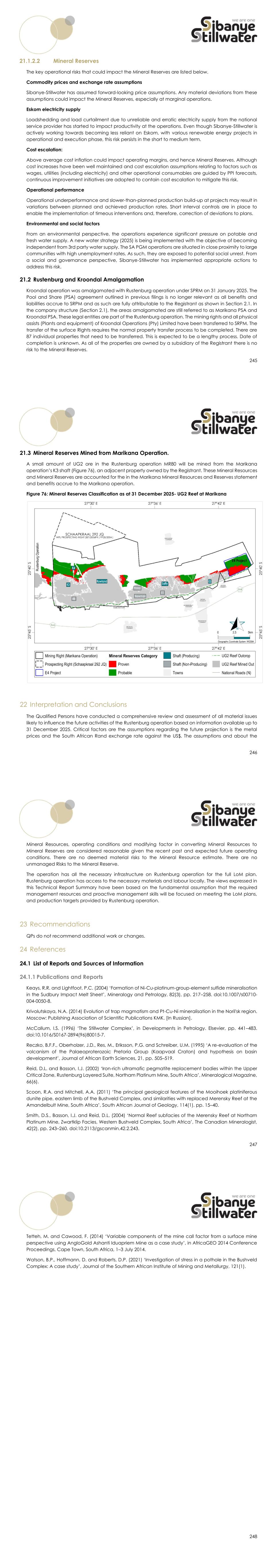 245 21.1.2.2 Mineral Reserves The key operational risks that could impact the Mineral Reserves are listed below. Commodity prices and exchange rate assumptions Sibanye-Stillwater has assumed forward-looking price assumptions. Any material deviations from these assumptions could impact the Mineral Reserves, especially at marginal operations. Eskom electricity supply Loadshedding and load curtailment due to unreliable and erratic electricity supply from the national service provider has started to impact productivity at the operations. Even though Sibanye-Stillwater is actively working towards becoming less reliant on Eskom, with various renewable energy projects in operational and execution phase, this risk persists in the short to medium term. Cost escalation: Above average cost inflation could impact operating margins, and hence Mineral Reserves. Although cost increases have been well maintained and cost escalation assumptions relating to factors such as wages, utilities (including electricity) and other operational consumables are guided by PPI forecasts, continuous improvement initiatives are adopted to contain cost escalation to mitigate this risk. Operational performance Operational underperformance and slower-than-planned production build-up at projects may result in variations between planned and achieved production rates. Short interval controls are in place to enable the implementation of timeous interventions and, therefore, correction of deviations to plans. Environmental and social factors From an environmental perspective, the operations experience significant pressure on potable and fresh water supply. A new water strategy (2025) is being implemented with the objective of becoming independent from 3rd party water supply. The SA PGM operations are situated in close proximity to large communities with high unemployment rates. As such, they are exposed to potential social unrest. From a social and governance perspective, Sibanye-Stillwater has implemented appropriate actions to address this risk. 21.2 Rustenburg and Kroondal Amalgamation Kroondal operation was amalgamated with Rustenburg operation under SPRM on 31 January 2025. The Pool and Share (PSA) agreement outlined in previous filings is no longer relevant as all benefits and liabilities accrue to SRPM and as such are fully attributable to the Registrant as shown in Section 2.1. In the company structure (Section 2.1), the areas amalgamated are still referred to as Marikana PSA and Kroondal PSA. These legal entities are part of the Rustenburg operation. The mining rights and all physical assists (Plants and equipment) of Kroondal Operations (Pty) Limited have been transferred to SRPM. The transfer of the surface Rights requires the normal property transfer process to be completed. There are 87 individual properties that need to be transferred. This is expected to be a lengthy process. Date of completion is unknown. As all of the properties are owned by a subsidiary of the Registrant there is no risk to the Mineral Reserves. 246 21.3 Mineral Reserves Mined from Marikana Operation. A small amount of UG2 ore in the Rustenburg operation MR80 will be mined from the Marikana operation’s K3 shaft (Figure 76), an adjacent property owned by the Registrant. These Mineral Resources and Mineral Reserves are accounted for the in the Marikana Mineral Resources and Reserves statement and benefits accrue to the Marikana operation. Figure 76: Mineral Reserves Classification as at 31 December 2025- UG2 Reef at Marikana 22 Interpretation and Conclusions The Qualified Persons have conducted a comprehensive review and assessment of all material issues likely to influence the future activities of the Rustenburg operation based on information available up to 31 December 2025. Critical factors are the assumptions regarding the future projection is the metal prices and the South African Rand exchange rate against the US$. The assumptions and about the 247 Mineral Resources, operating conditions and modifying factor in converting Mineral Resources to Mineral Reserves are considered reasonable given the recent past and expected future operating conditions. There are no deemed material risks to the Mineral Resource estimate. There are no unmanaged Risks to the Mineral Reserve. The operation has all the necessary infrastructure on Rustenburg operation for the full LoM plan. Rustenburg operation has access to the necessary materials and labour locally. The views expressed in this Technical Report Summary have been based on the fundamental assumption that the required management resources and proactive management skills will be focused on meeting the LoM plans, and production targets provided by Rustenburg operation. 23 Recommendations QPs do not recommend additional work or changes. 24 References 24.1 List of Reports and Sources of Information 24.1.1 Publications and Reports Keays, R.R. and Lightfoot, P.C. (2004) ‘Formation of Ni-Cu-platinum-group-element sulfide mineralisation in the Sudbury Impact Melt Sheet’, Mineralogy and Petrology, 82(3), pp. 217–258. doi:10.1007/s00710- 004-0050-8. Krivolutskaya, N.A. (2014) Evolution of trap magmatism and Pt-Cu-Ni mineralisation in the Noril'sk region. Moscow: Publishing Association of Scientific Publications KMK. [In Russian]. McCallum, I.S. (1996) ‘The Stillwater Complex’, in Developments in Petrology. Elsevier, pp. 441–483. doi:10.1016/S0167-2894(96)80015-7. Reczko, B.F.F., Oberholzer, J.D., Res, M., Eriksson, P.G. and Schreiber, U.M. (1995) ‘A re-evaluation of the volcanism of the Palaeoproterozoic Pretoria Group (Kaapvaal Craton) and hypothesis on basin development’, Journal of African Earth Sciences, 21, pp. 505–519. Reid, D.L. and Basson, I.J. (2002) ‘Iron-rich ultramafic pegmatite replacement bodies within the Upper Critical Zone, Rustenburg Layered Suite, Northam Platinum Mine, South Africa’, Mineralogical Magazine, 66(6). Scoon, R.A. and Mitchell, A.A. (2011) ‘The principal 