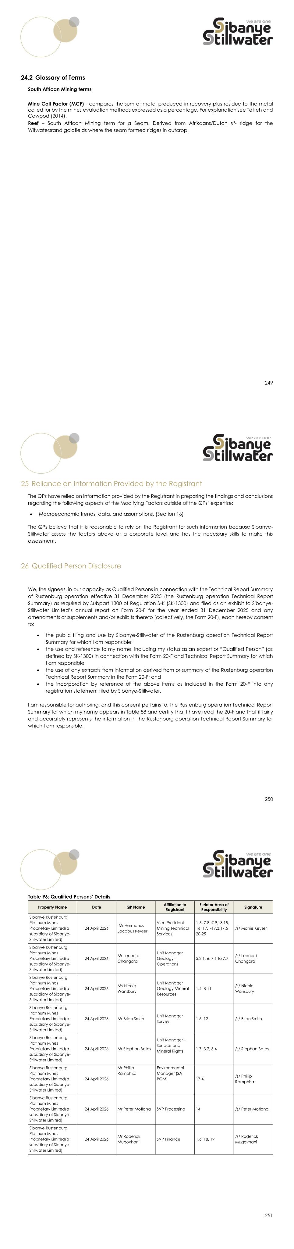 249 24.2 Glossary of Terms South African Mining terms Mine Call Factor (MCF) - compares the sum of metal produced in recovery plus residue to the metal called for by the mines evaluation methods expressed as a percentage. For explanation see Tetteh and Cawood (2014). Reef – South African Mining term for a Seam. Derived from Afrikaans/Dutch rif- ridge for the Witwatersrand goldfields where the seam formed ridges in outcrop. 250 25 Reliance on Information Provided by the Registrant The QPs have relied on information provided by the Registrant in preparing the findings and conclusions regarding the following aspects of the Modifying Factors outside of the QPs’ expertise: • Macroeconomic trends, data, and assumptions, (Section 16) The QPs believe that it is reasonable to rely on the Registrant for such information because Sibanye- Stillwater assess the factors above at a corporate level and has the necessary skills to make this assessment. 26 Qualified Person Disclosure We, the signees, in our capacity as Qualified Persons in connection with the Technical Report Summary of Rustenburg operation effective 31 December 2025 (the Rustenburg operation Technical Report Summary) as required by Subpart 1300 of Regulation S-K (SK-1300) and filed as an exhibit to Sibanye- Stillwater Limited’s annual report on Form 20-F for the year ended 31 December 2025 and any amendments or supplements and/or exhibits thereto (collectively, the Form 20-F), each hereby consent to: • the public filing and use by Sibanye-Stillwater of the Rustenburg operation Technical Report Summary for which I am responsible; • the use and reference to my name, including my status as an expert or “Qualified Person” (as defined by SK-1300) in connection with the Form 20-F and Technical Report Summary for which I am responsible; • the use of any extracts from information derived from or summary of the Rustenburg operation Technical Report Summary in the Form 20-F; and • the incorporation by reference of the above items as included in the Form 20-F into any registration statement filed by Sibanye-Stillwater. I am responsible for authoring, and this consent pertains to, the Rustenburg operation Technical Report Summary for which my name appears in Table 88 and certify that I have read the 20-F and that it fairly and accurately represents the information in the Rustenburg operation Technical Report Summary for which I am responsible. 251 Table 96: Qualified Persons’ Details Property Name Date QP Name Affiliation to Registrant Field or Area of Responsibility Signature Sibanye Rustenburg Platinum Mines Proprietary Limited(a subsidiary of Sibanye- Stillwater Limited) 24 April 2026 Mr Hermanus Jacobus Keyser Vice President Mining Technical Services 1-5, 7.8, 7.9,13,15, 16, 17.1-17.3,17.5 20-25 /s/ Manie Keyser Sibanye Rustenburg Platinum Mines Proprietary Limited(a subsidiary of Sibanye- Stillwater Limited) 24 April 2026 Mr Leonard Changara Unit Manager Geology - Operations 5.2.1, 6, 7.1 to 7.7 /s/ Leonard Changara Sibanye Rustenburg Platinum Mines Proprietary Limited(a subsidiary of Sibanye- Stillwater Limited) 24 April 2026 Ms Nicole Wansbury Unit Manager Geology Mineral Resources 1.4, 8-11 /s/ Nicole Wansbury Sibanye Rustenburg Platinum Mines Proprietary Limited(a subsidiary of Sibanye- Stillwater Limited) 24 April 2026 Mr Brian Smith Unit Manager Survey 1.5, 12 /s/ Brian Smith Sibanye Rustenburg Platinum Mines Proprietary Limited(a subsidiary of Sibanye- Stillwater Limited) 24 April 2026 Mr Stephan Botes Unit Manager – Surface and Mineral Rights 1.7, 3.2, 3.4 /s/ Stephan Botes Sibanye Rustenburg Platinum Mines Proprietary Limited(a subsidiary of Sibanye- Stillwater Limited) 24 April 2026 Mr Phillip Ramphisa Environmental Manager (SA PGM) 17.4 /s/ Phillip Ramphisa Sibanye Rustenburg Platinum Mines Proprietary Limited(a subsidiary of Sibanye- Stillwater Limited) 24 April 2026 Mr Peter Motlana SVP Processing 14 /s/ Peter Motlana Sibanye Rustenburg Platinum Mines Proprietary Limited(a subsidiary of Sibanye- Stillwater Limited) 24 April 2026 Mr Roderick Mugovhani SVP Finance 1.6, 18, 19 /s/ Roderick Mugovhani