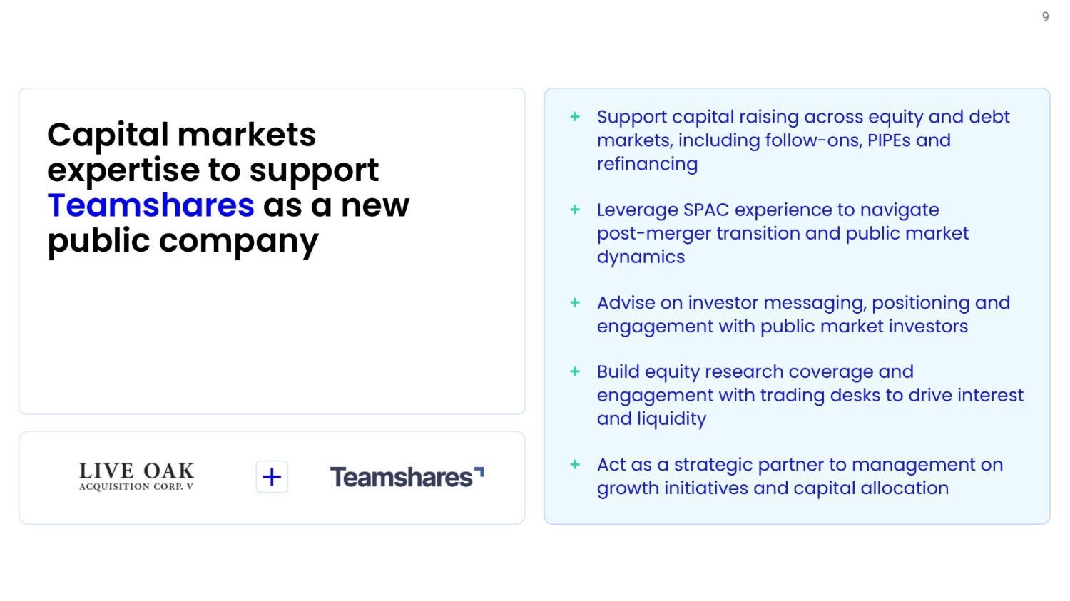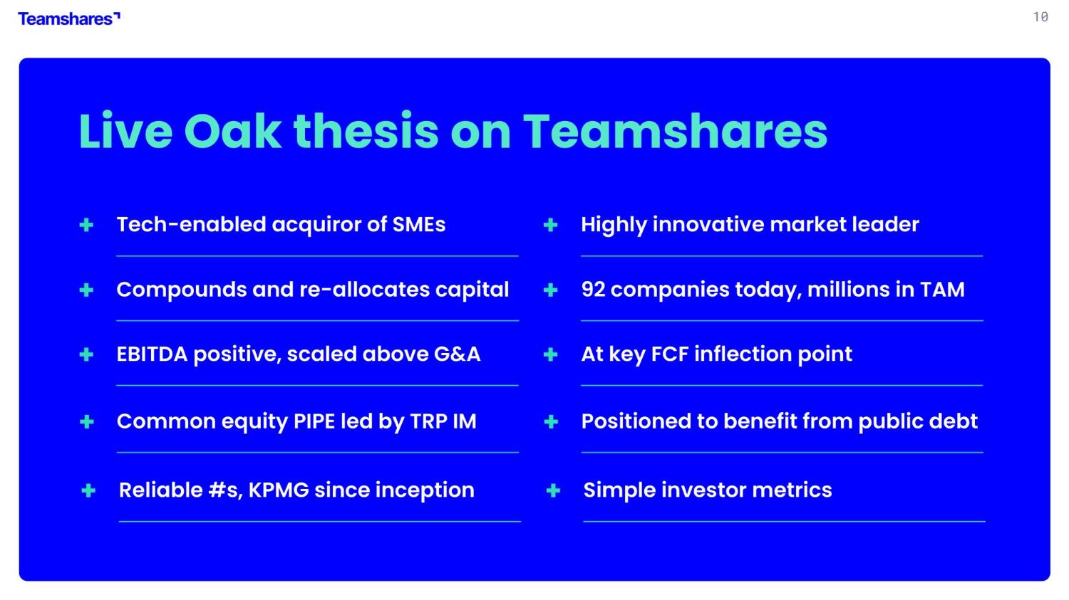 9 Capital markets expertise to support Teamshares as a new public company + Support capital raising across equity and debt markets, including follow - ons, PIPEs and refinancing + Leverage SPAC experience to navigate post - merger transition and public market dynamics + Advise on investor messaging, positioning and engagement with public market investors + Build equity research coverage and engagement with trading desks to drive interest and liquidity + Act as a strategic partner to management on growth initiatives and capital allocation