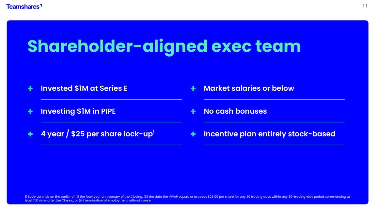 10 Live Oak thesis on Teamshares Highly innovative market leader + Tech - enabled acquiror of SMEs + 92 companies today, millions in TAM + Compounds and re - allocates capital + At key FCF inflection point + EBITDA positive, scaled above G&A + Positioned to benefit from public debt + Common equity PIPE led by TRP IM + Simple investor metrics + Reliable #s, KPMG since inception +