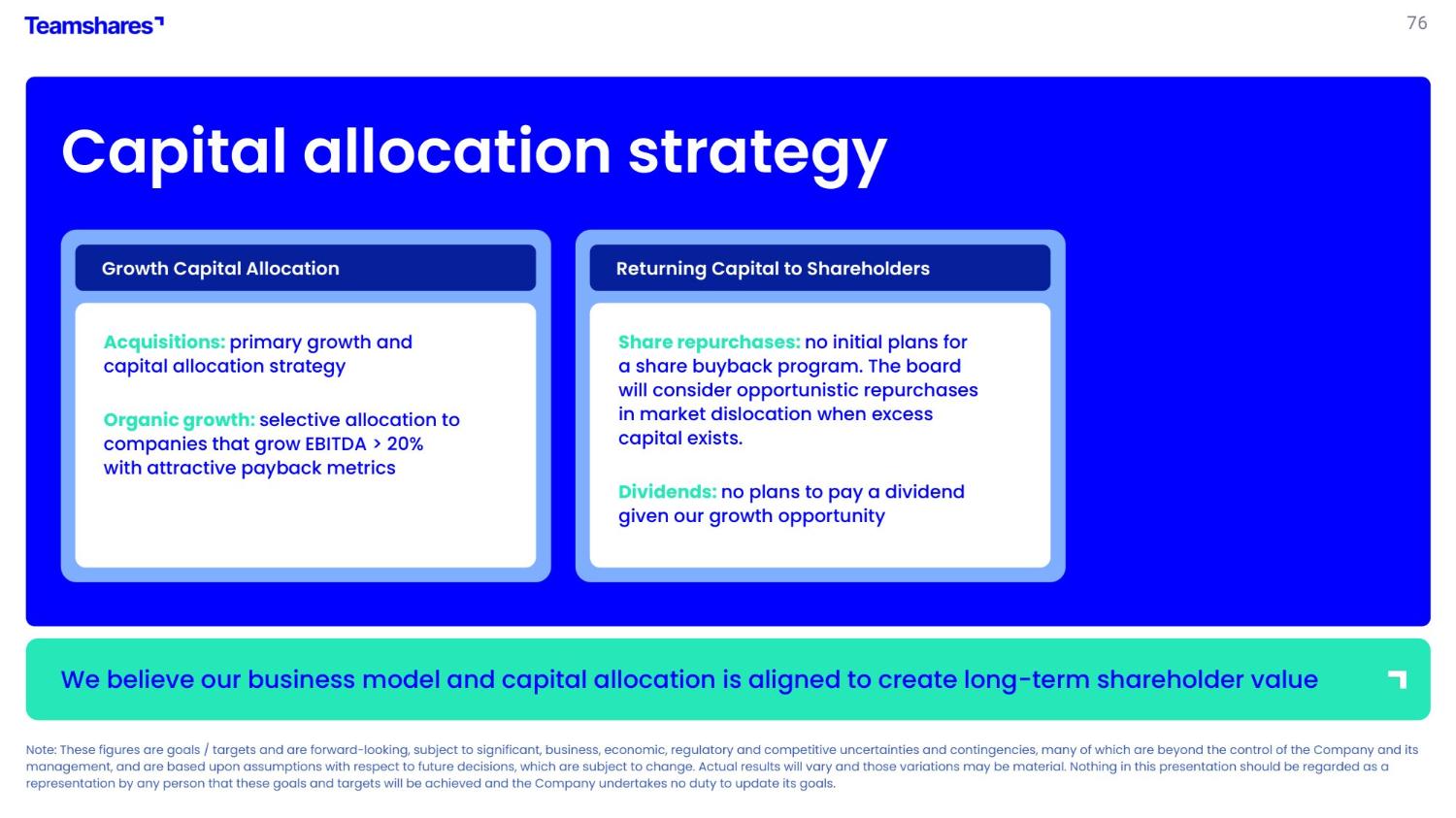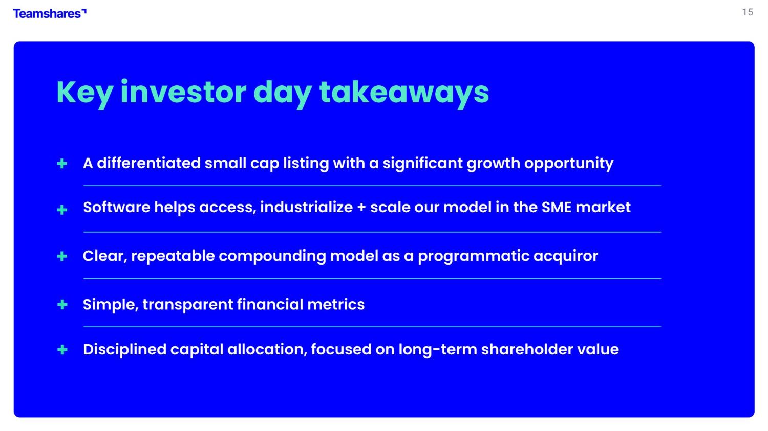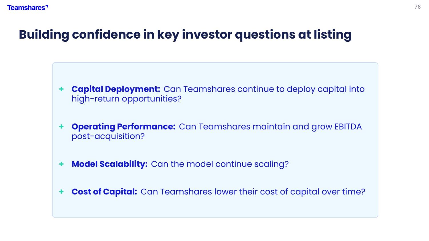 78 + Capital Deployment: Can Teamshares continue to deploy capital into high - return opportunities? + Operating Performance: Can Teamshares maintain and grow EBITDA post - acquisition? + Model Scalability: Can the model continue scaling? + Cost of Capital: Can Teamshares lower their cost of capital over time? Building confidence in key investor questions at listing