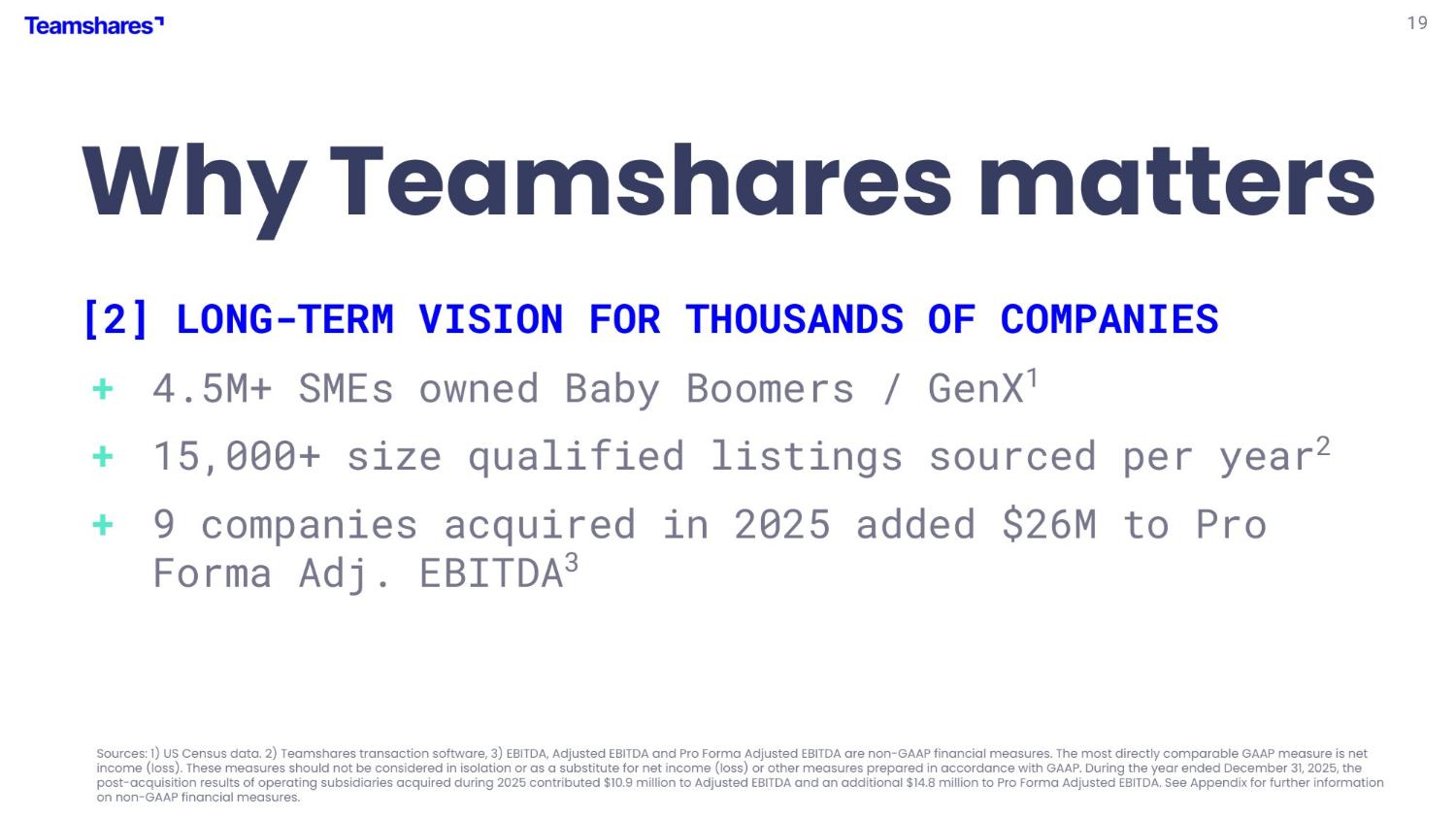 19 Why Teamshares matters [2] LONG - TERM VISION FOR THOUSANDS OF COMPANIES per year 2 4.5M+ SMEs owned Baby Boomers / GenX 1 15,000+ size qualified listings sourced + + to Pro 9 companies acquired in 2025 added $26M + Forma Adj. EBITDA 3 Sources: 1) US Census data. 2) Teamshares transaction software, 3) EBITDA, Adjusted EBITDA and Pro Forma Adjusted EBITDA are non - GAAP financial measures. The most directly comparable GAAP measure is net income (loss). These measures should not be considered in isolation or as a substitute for net income (loss) or other measures prepared in accordance with GAAP. During the year ended December 31, 2025, the post - acquisition results of operating subsidiaries acquired during 2025 contributed $10.9 million to Adjusted EBITDA and an additional $14.8 million to Pro Forma Adjusted EBITDA. See Appendix for further information on non - GAAP financial measures.