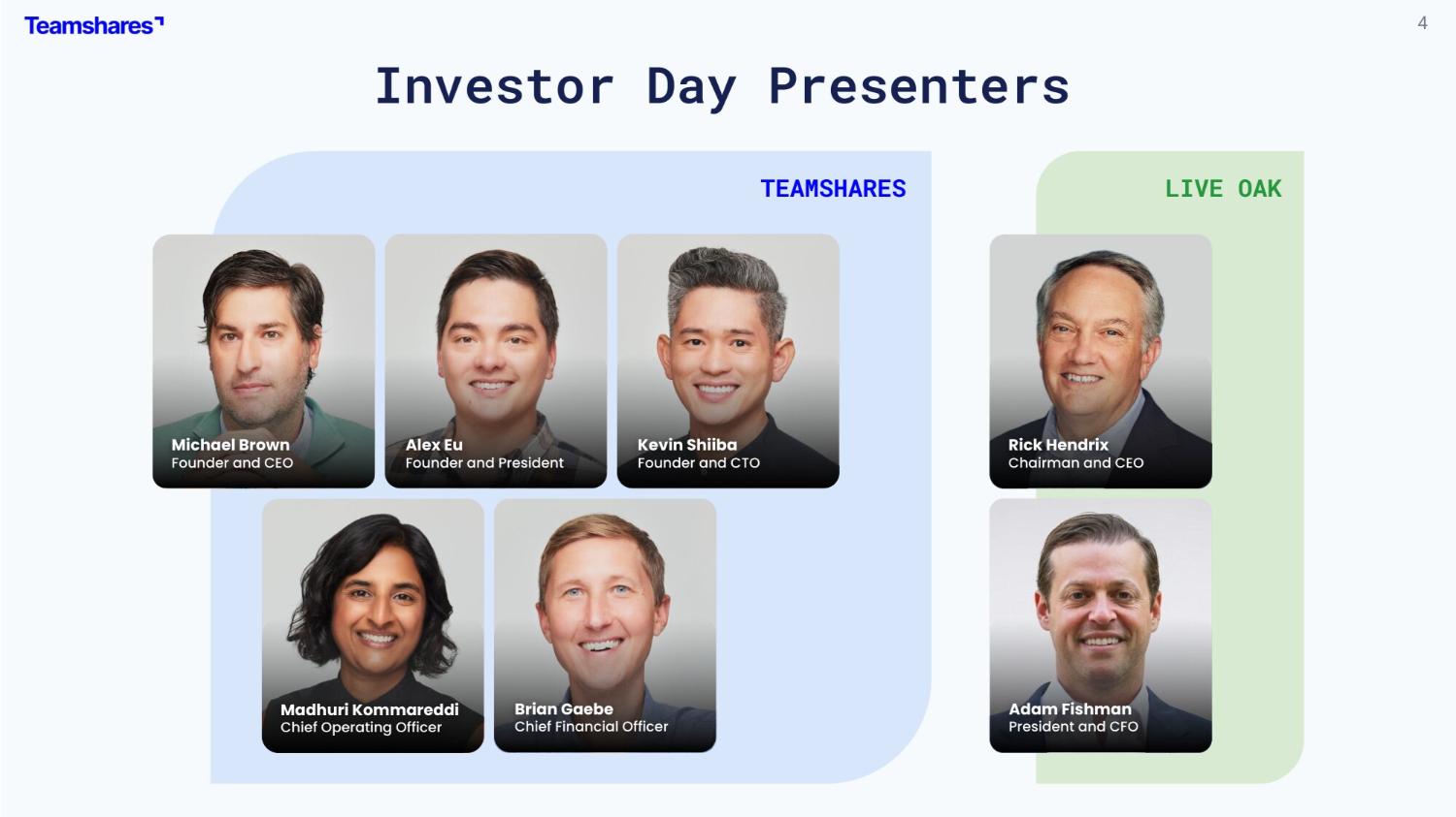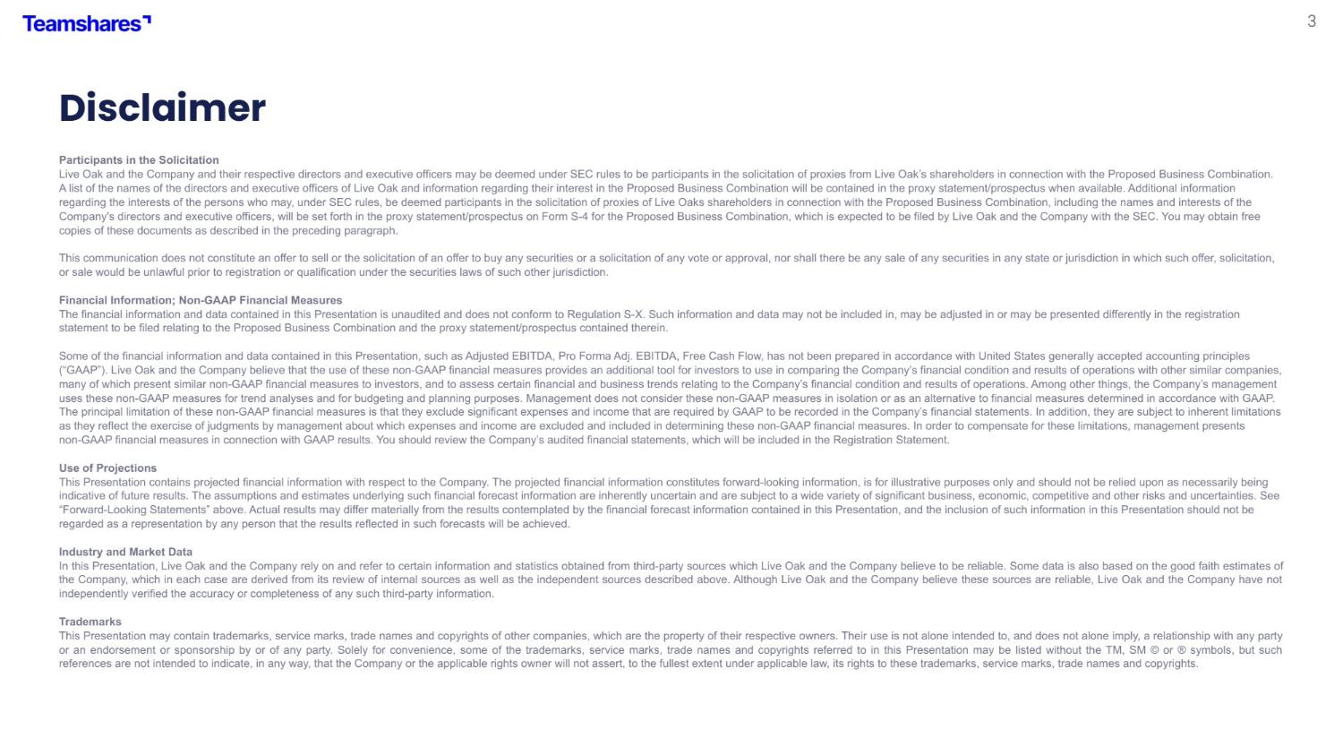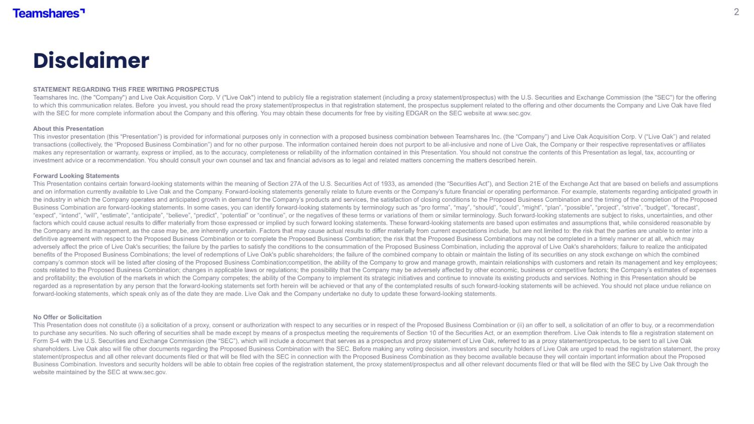 2 Disclaimer STATEMENT REGARDING THIS FREE WRITING PROSPECTUS Teamshares Inc. (the "Company") and Live Oak Acquisition Corp. V ("Live Oak") intend to publicly file a registration statement (including a proxy statement/prospectus) with the U.S. Securities and Exchange Commission (the "SEC") for the offering to which this communication relates. Before you invest, you should read the proxy statement/prospectus in that registration statement, the prospectus supplement related to the offering and other documents the Company and Live Oak have filed with the SEC for more complete information about the Company and this offering. You may obtain these documents for free by visiting EDGAR on the SEC website at www.sec.gov. About this Presentation This investor presentation (this “Presentation”) is provided for informational purposes only in connection with a proposed business combination between Teamshares Inc. (the “Company”) and Live Oak Acquisition Corp. V (“Live Oak”) and related transactions (collectively, the “Proposed Business Combination”) and for no other purpose. The information contained herein does not purport to be all - inclusive and none of Live Oak, the Company or their respective representatives or affiliates makes any representation or warranty, express or implied, as to the accuracy, completeness or reliability of the information contained in this Presentation. You should not construe the contents of this Presentation as legal, tax, accounting or investment advice or a recommendation. You should consult your own counsel and tax and financial advisors as to legal and related matters concerning the matters described herein. Forward Looking Statements This Presentation contains certain forward - looking statements within the meaning of Section 27A of the U.S. Securities Act of 1933, as amended (the “Securities Act”), and Section 21E of the Exchange Act that are based on beliefs and assumptions and on information currently available to Live Oak and the Company. Forward - looking statements generally relate to future events or the Company’s future financial or operating performance. For example, statements regarding anticipated growth in the industry in which the Company operates and anticipated growth in demand for the Company’s products and services, the satisfaction of closing conditions to the Proposed Business Combination and the timing of the completion of the Proposed Business Combination are forward - looking statements. In some cases, you can identify forward - looking statements by terminology such as “pro forma”, “may”, “should”, “could”, “might”, “plan”, “possible”, “project”, “strive”, “budget”, “forecast”, “expect”, “intend”, “will”, “estimate”, “anticipate”, “believe”, “predict”, “potential” or “continue”, or the negatives of these terms or variations of them or similar terminology. Such forward - looking statements are subject to risks, uncertainties, and other factors which could cause actual results to differ materially from those expressed or implied by such forward looking statements. These forward - looking statements are based upon estimates and assumptions that, while considered reasonable by the Company and its management, as the case may be, are inherently uncertain. Factors that may cause actual results to differ materially from current expectations include, but are not limited to: the risk that the parties are unable to enter into a definitive agreement with respect to the Proposed Business Combination or to complete the Proposed Business Combination; the risk that the Proposed Business Combinations may not be completed in a timely manner or at all, which may adversely affect the price of Live Oak's securities; the failure by the parties to satisfy the conditions to the consummation of the Proposed Business Combination, including the approval of Live Oak's shareholders; failure to realize the anticipated benefits of the Proposed Business Combinations; the level of redemptions of Live Oak's public shareholders; the failure of the combined company to obtain or maintain the listing of its securities on any stock exchange on which the combined company’s common stock will be listed after closing of the Proposed Business Combination;competition, the ability of the Company to grow and manage growth, maintain relationships with customers and retain its management and key employees; costs related to the Proposed Business Combination; changes in applicable laws or regulations; the possibility that the Company may be adversely affected by other economic, business or competitive factors; the Company’s estimates of expenses and profitability; the evolution of the markets in which the Company competes; the ability of the Company to implement its strategic initiatives and continue to innovate its existing products and services. Nothing in this Presentation should be regarded as a representation by any person that the forward - looking statements set forth herein will be achieved or that any of the contemplated results of such forward - looking statements will be achieved. You should not place undue reliance on forward - looking statements, which speak only as of the date they are made. Live Oak and the Company undertake no duty to update these forward - looking statements. No Offer or Solicitation This Presentation does not constitute (i) a solicitation of a proxy, consent or authorization with respect to any securities or in respect of the Proposed Business Combination or (ii) an offer to sell, a solicitation of an offer to buy, or a recommendation to purchase any securities. No such offering of securities shall be made except by means of a prospectus meeting the requirements of Section 10 of the Securities Act, or an exemption therefrom. Live Oak intends to file a registration statement on Form S - 4 with the U.S. Securities and Exchange Commission (the “SEC”),