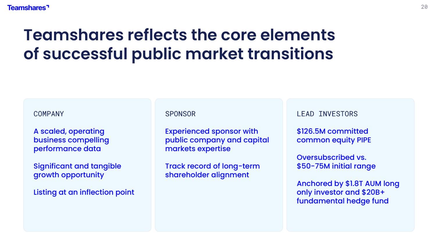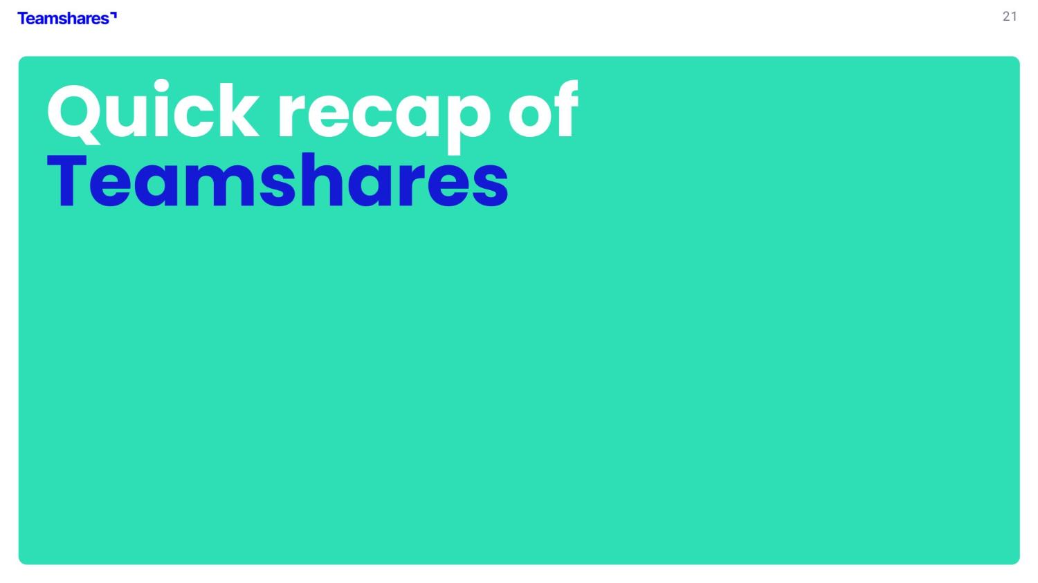 20 COMPANY A scaled, operating business compelling performance data Significant and tangible growth opportunity Listing at an inflection point Teamshares reflects the core elements of successful public market transitions SPONSOR Experienced sponsor with public company and capital markets expertise Track record of long - term shareholder alignment LEAD INVESTORS $126.5M committed common equity PIPE Oversubscribed vs. $50 - 75M initial range Anchored by $1.8T AUM long only investor and $20B+ fundamental hedge fund