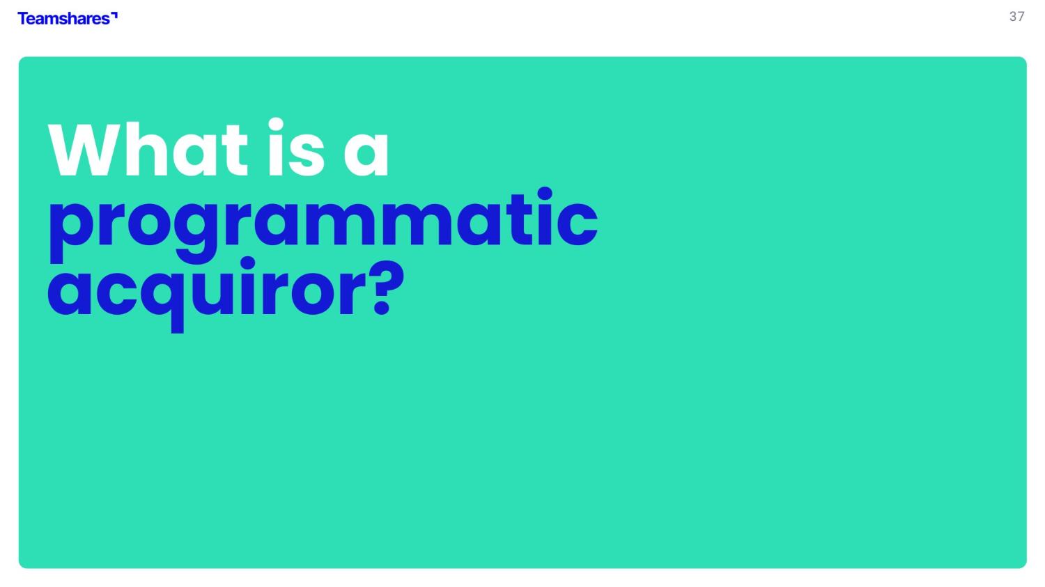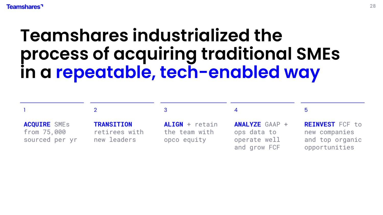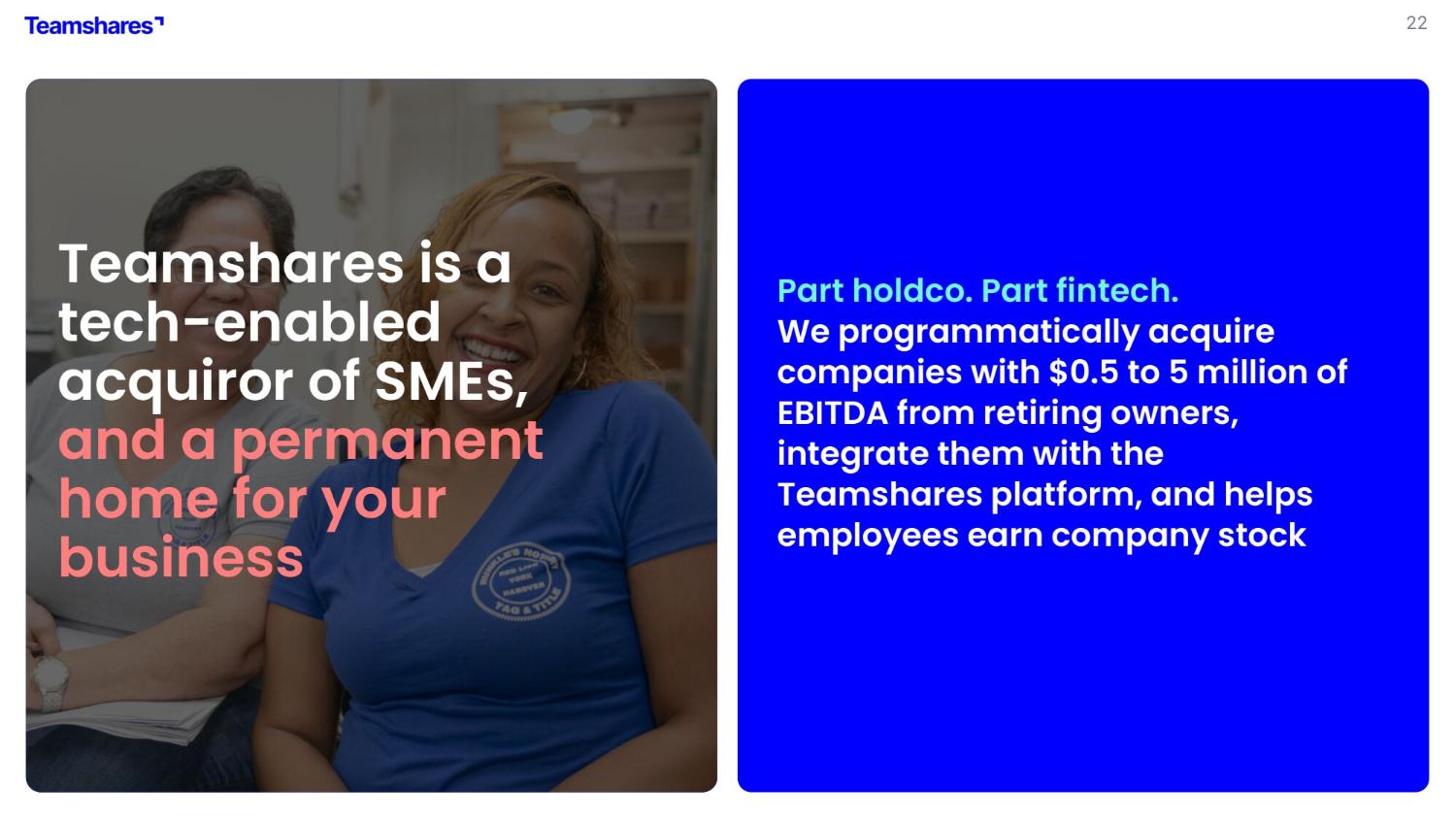 22 Teamshares is a tech - enabled acquiror of SMEs, and a permanent home for your business Part holdco. Part fintech. We programmatically acquire companies with $0.5 to 5 million of EBITDA from retiring owners, integrate them with the Teamshares platform, and helps employees earn company stock