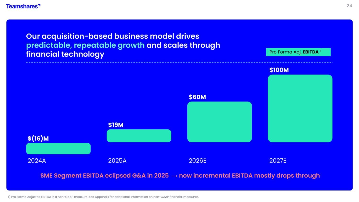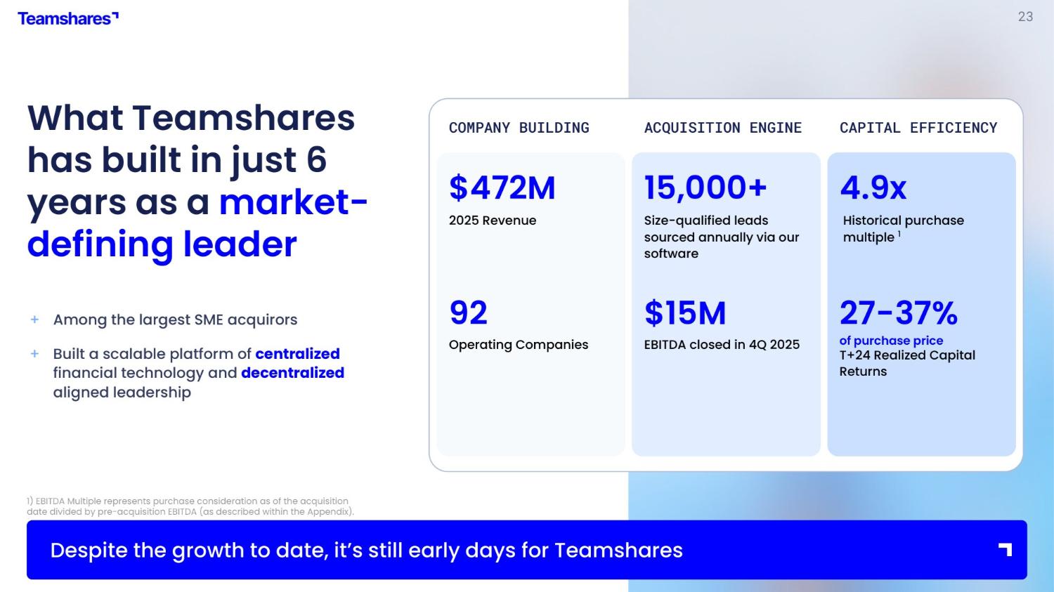 23 What Teamshares has built in just 6 years as a market - defining leader + Among the largest SME acquirors + Built a scalable platform of centralized financial technology and decentralized aligned leadership 23 ACQUISITION ENGINE COMPANY BUILDING CAPITAL EFFICIENCY 15,000+ Size - qualified leads sourced annually via our software 27 - 37% of purchase price T+24 Realized Capital Returns Despite the growth to date, it’s still early days for Teamshares 92 Operating Companies $15M EBITDA closed in 4Q 2025 4.9x Historical purchase multiple 1 1) EBITDA Multiple represents purchase consideration as of the acquisition date divided by pre - acquisition EBITDA (as described within the Appendix). $472M 2025 Revenue