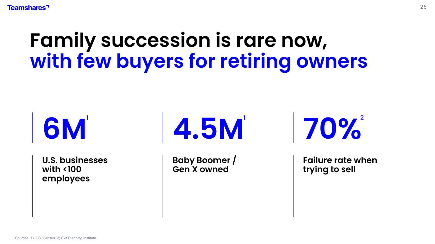 26 U.S. businesses with <100 employees Sources: 1) U.S. Census. 2).Exit Planning Institute. Baby Boomer / Gen X owned Failure rate when trying to sell 6 M 1 4.5 M 1 70% 2 Family succession is rare now, with few buyers for retiring owners