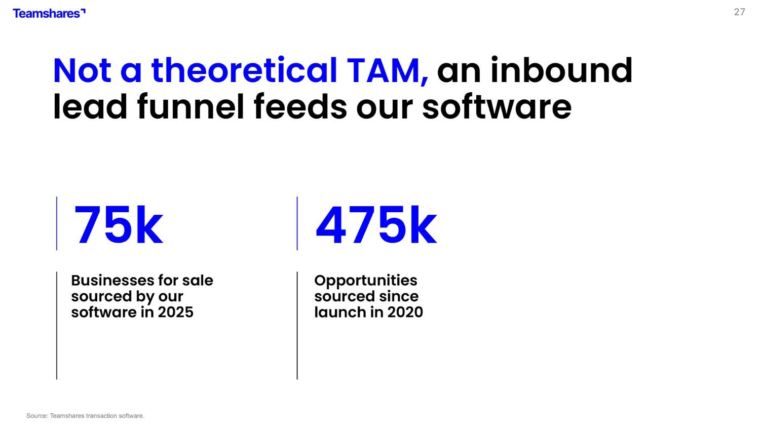 27 75k Businesses for sale sourced by our software in 2025 Not a theoretical TAM, an inbound lead funnel feeds our software 475k Opportunities sourced since launch in 2020 Source: Teamshares transaction software.
