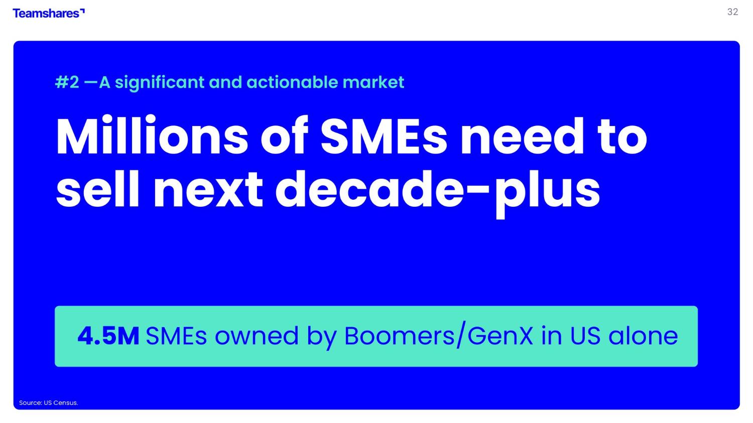 32 Millions of SMEs need to sell next decade - plus #2 — A significant and actionable market 4.5M SMEs owned by Boomers/GenX in US alone Source: US Census.