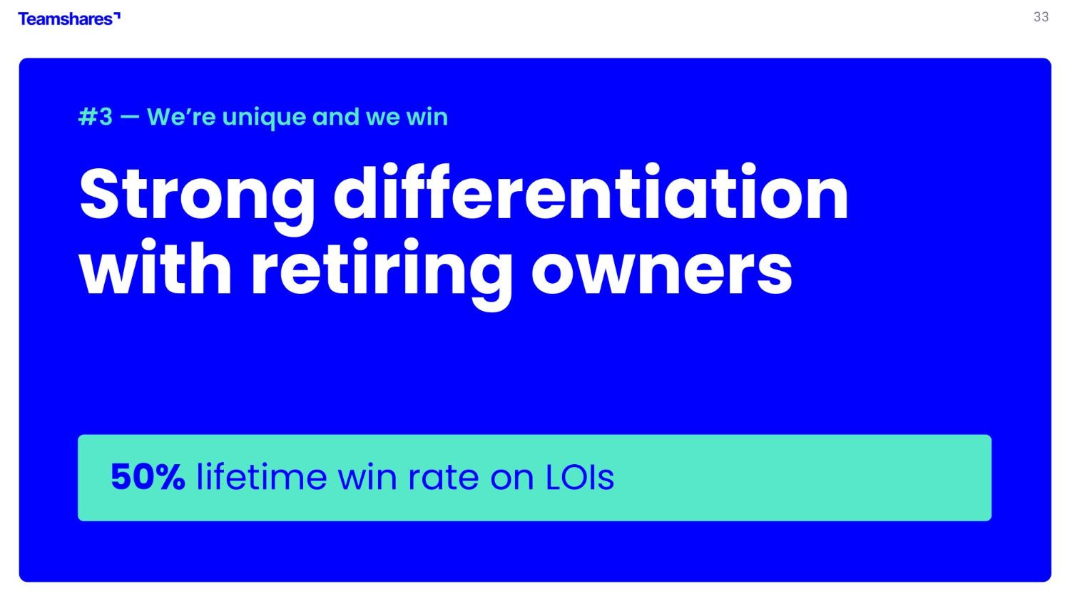 33 Strong differentiation with retiring owners #3 — We’re unique and we win 50% lifetime win rate on LOIs
