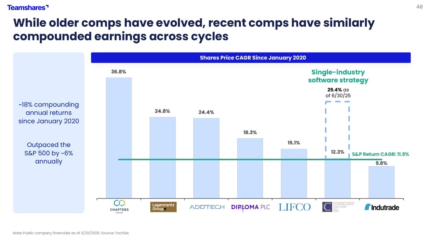 40 While older comps have evolved, recent comps have similarly compounded earnings across cycles Note : Public company financials as of 3/20/2026. Source: FactSet. ~18% compounding annual returns since January 2020 Outpaced the S&P 500 by ~6% annually Shares Price CAGR Since January 2020 Single - industry software strategy 29.4% as of 6/30/25