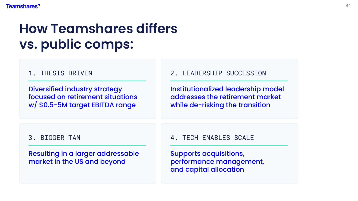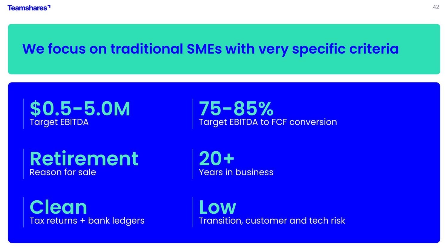 41 How Teamshares differs vs. public comps: 1. THESIS DRIVEN Diversified industry strategy focused on retirement situations w/ $0.5 - 5M target EBITDA range 2. LEADERSHIP SUCCESSION Institutionalized leadership model addresses the retirement market while de - risking the transition 3. BIGGER TAM Resulting in a larger addressable market in the US and beyond 4. TECH ENABLES SCALE Supports acquisitions, performance management, and capital allocation