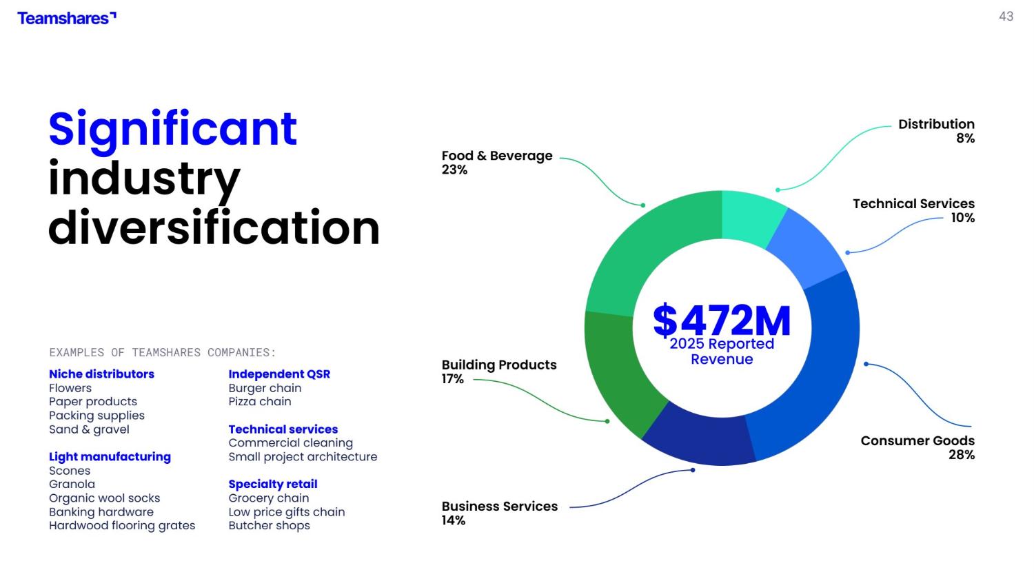 43 Significant industry diversification Food & Beverage 23% Distribution 8% Technical Services 10% Consumer Goods 28% Business Services 14% Building Products 17% $472M 2025 Reported Revenue Niche distributors Flowers Paper products Packing supplies Sand & gravel Light manufacturing Scones Granola Organic wool socks Banking hardware Hardwood flooring grates Independent QSR Burger chain Pizza chain Technical services Commercial cleaning Small project architecture Specialty retail Grocery chain Low price gifts chain Butcher shops EXAMPLES OF TEAMSHARES COMPANIES: