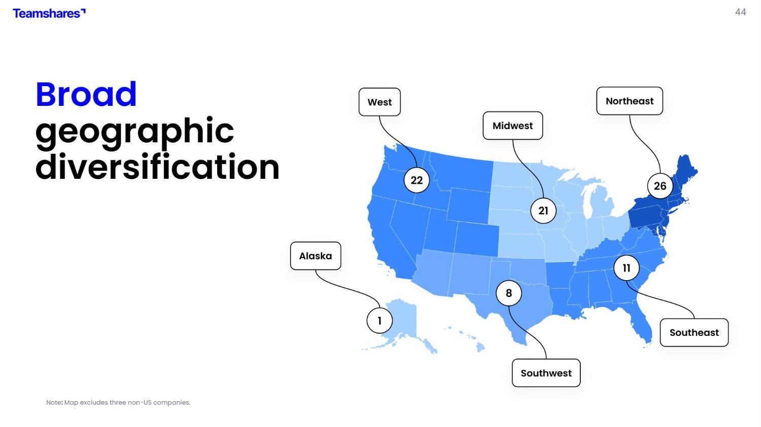 44 Broad geographic diversification 1 8 22 21 West Midwest Alaska 26 Northeast Southwest 11 Southeast Note : Map excludes three non - US companies.