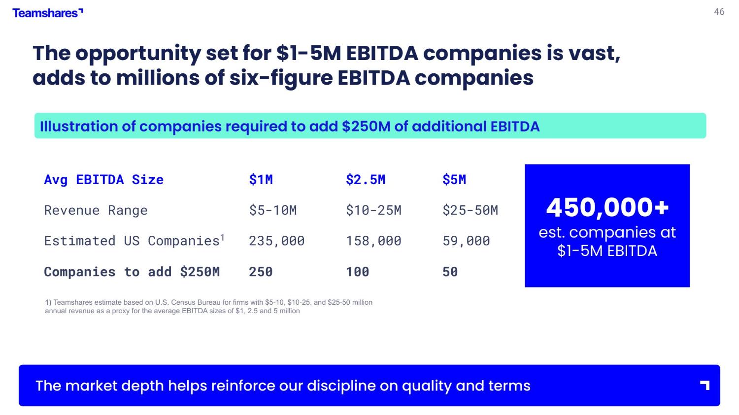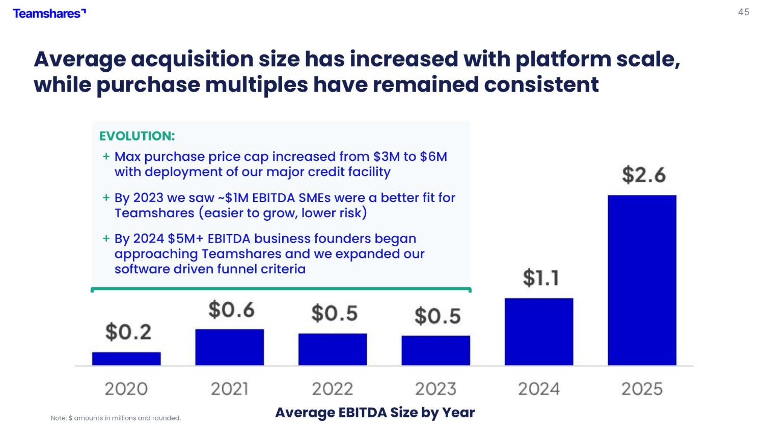 45 Note: $ amounts in millions and rounded. Average acquisition size has increased with platform scale, while purchase multiples have remained consistent EVOLUTION: + Max purchase price cap increased from $3M to $6M with deployment of our major credit facility + By 2023 we saw ~$1M EBITDA SMEs were a better fit for Teamshares (easier to grow, lower risk) + By 2024 $5M+ EBITDA business founders began approaching Teamshares and we expanded our software driven funnel criteria Average EBITDA Size by Year