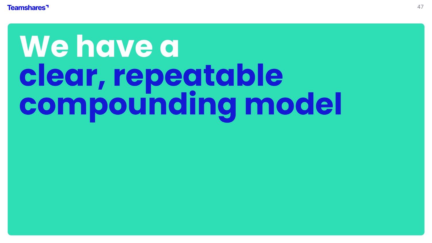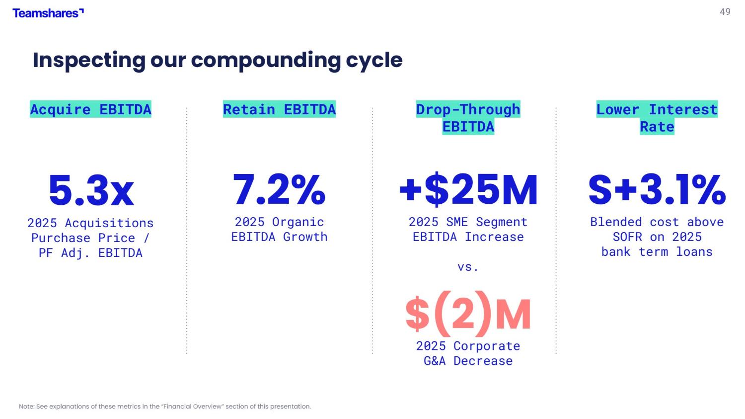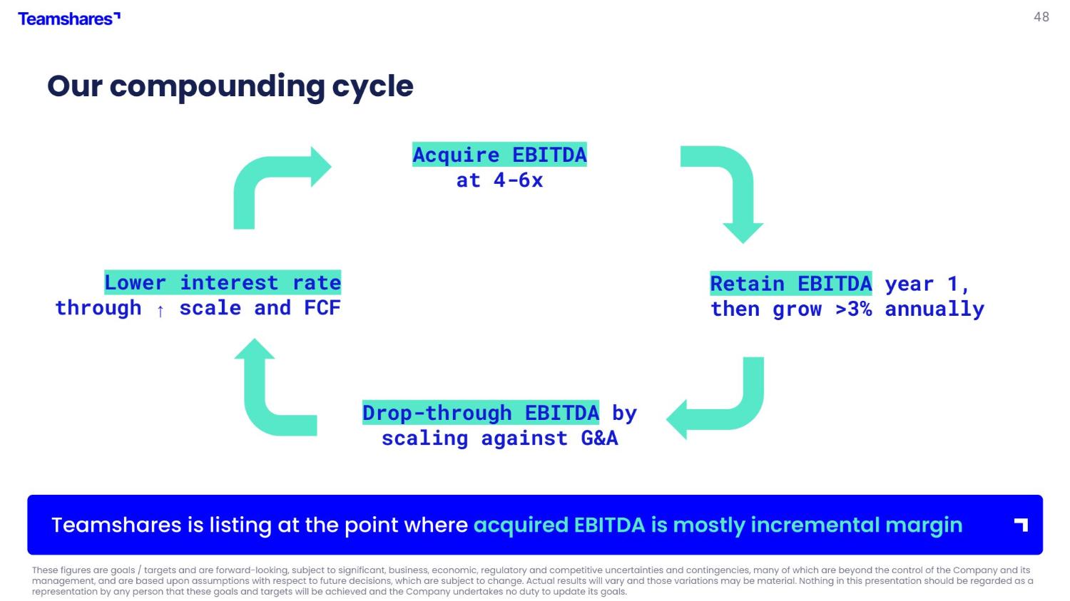 48 Teamshares is listing at the point where acquired EBITDA is mostly incremental margin These figures are goals / targets and are forward - looking, subject to significant, business, economic, regulatory and competitive uncertainties and contingencies, many of which are beyond the control of the Company and its management, and are based upon assumptions with respect to future decisions, which are subject to change. Actual results will vary and those variations may be material. Nothing in this presentation should be regarded as a representation by any person that these goals and targets will be achieved and the Company undertakes no duty to update its goals. Our compounding cycle Acquire EBITDA at 4 - 6x Retain EBITDA year 1, then grow >3% annually Lower interest rate through ↑ scale and FCF Drop - through EBITDA by scaling against G&A