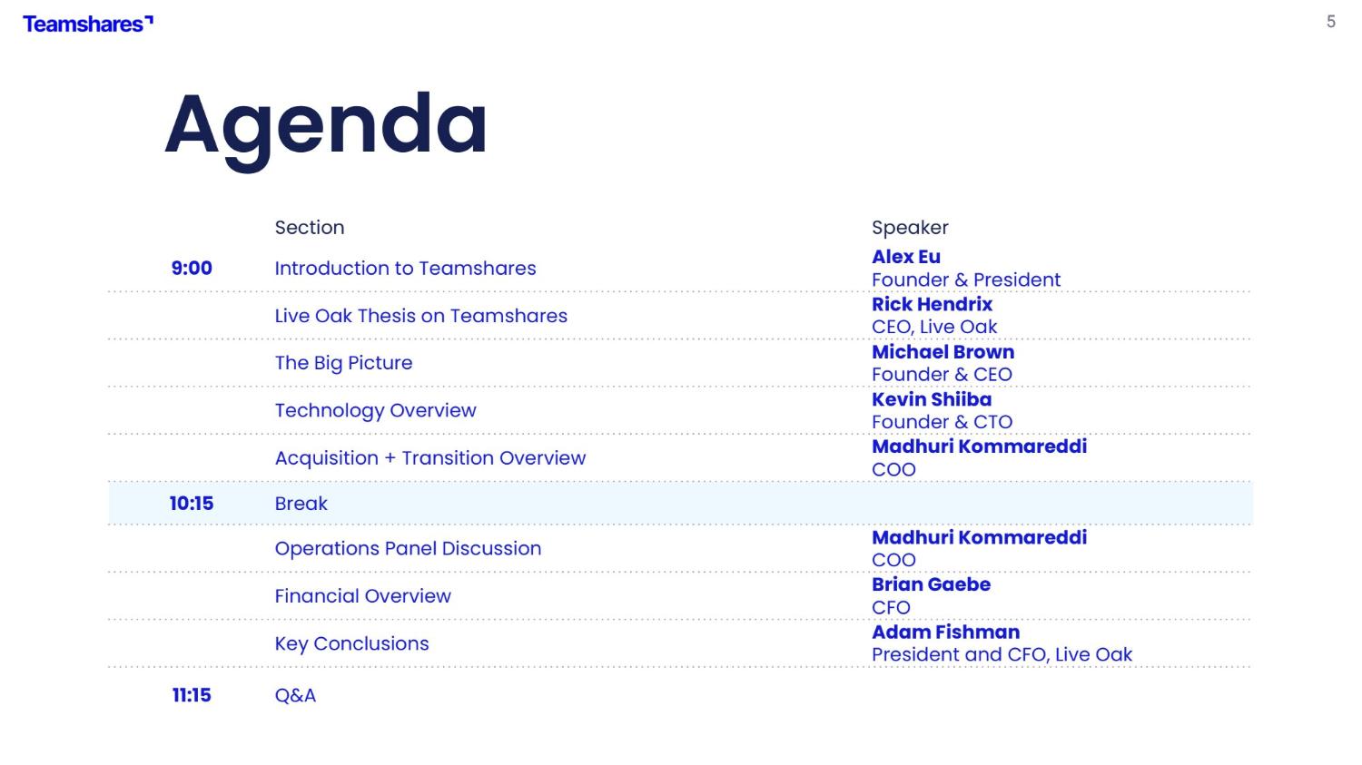 4 Adam Fishman President and CFO Michael Brown Founder and CEO Alex Eu Founder and President Brian Gaebe Chief Financial Officer Rick Hendrix Chairman and CEO Madhuri Kommareddi Chief Operating Officer Investor Day Presenters Kevin Shiiba Founder and CTO TEAMSHARES LIVE OAK