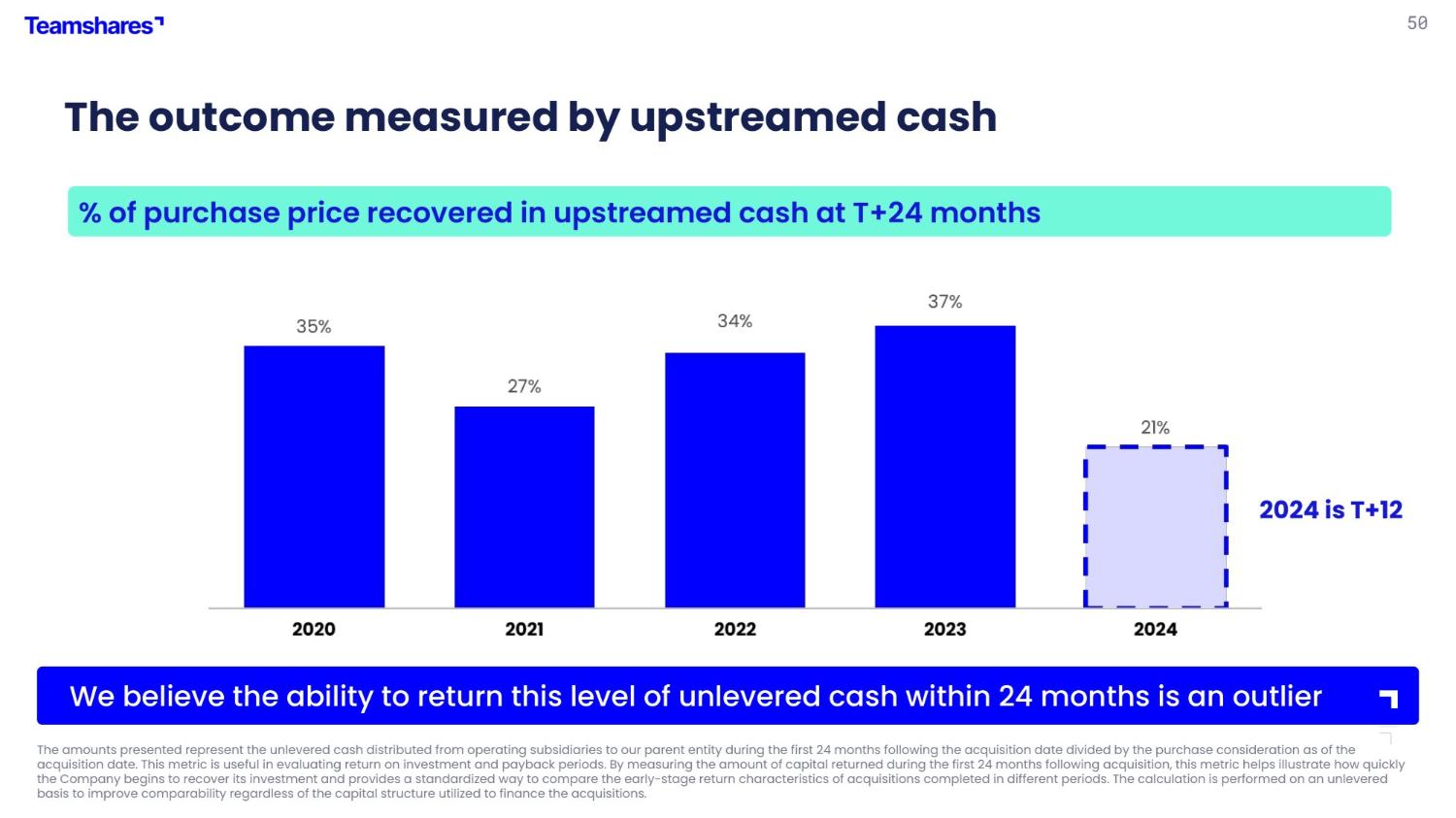 50 The outcome measured by upstreamed cash We believe the ability to return this level of unlevered cash within 24 months is an outlier The amounts presented represent the unlevered cash distributed from operating subsidiaries to our parent entity during the first 24 months following the acquisition date divided by the purchase consideration as of the acquisition date. This metric is useful in evaluating return on investment and payback periods. By measuring the amount of capital returned during the first 24 months following acquisition, this metric helps illustrate how quickly the Company begins to recover its investment and provides a standardized way to compare the early - stage return characteristics of acquisitions completed in different periods. The calculation is performed on an unlevered basis to improve comparability regardless of the capital structure utilized to finance the acquisitions. % of purchase price recovered in upstreamed cash at T+24 months 2024 is T+12