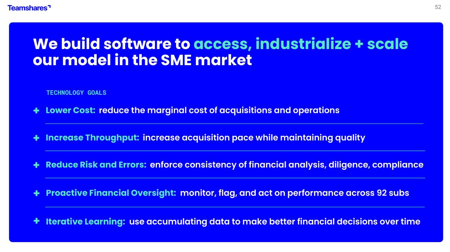 52 We build software to access, industrialize + scale our model in the SME market TECHNOLOGY GOALS + Lower Cost: reduce the marginal cost of acquisitions and operations + Increase Throughput: increase acquisition pace while maintaining quality + Reduce Risk and Errors: enforce consistency of financial analysis, diligence, compliance + Proactive Financial Oversight: monitor, flag, and act on performance across 92 subs + Iterative Learning: use accumulating data to make better financial decisions over time