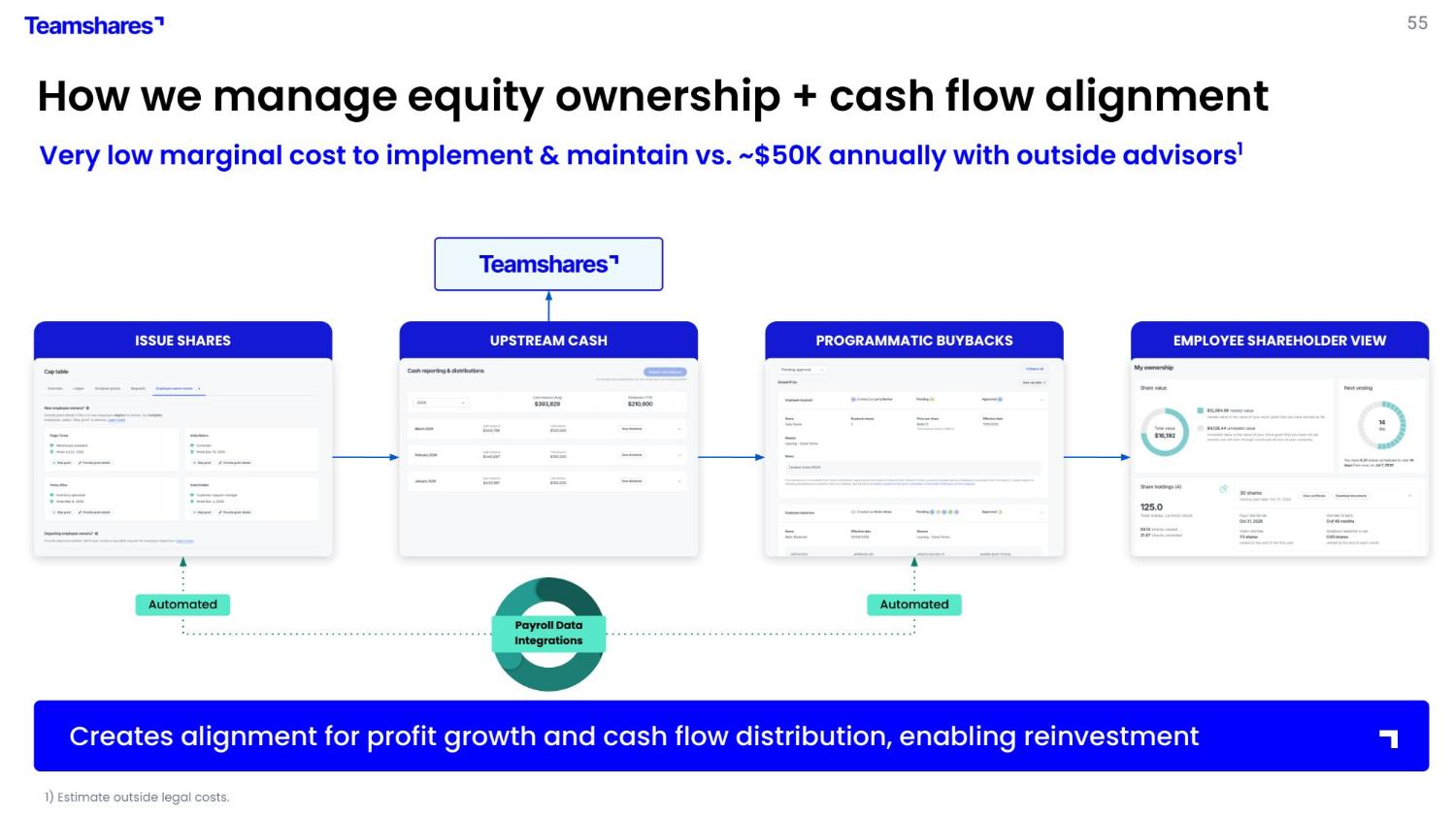 55 Very low marginal cost to implement & maintain vs. ~$50K annually with outside advisors 1 How we manage equity ownership + cash flow alignment ISSUE SHARES UPSTREAM CASH PROGRAMMATIC BUYBACKS EMPLOYEE SHAREHOLDER VIEW Payroll Data Integrations Automated Automated Creates alignment for profit growth and cash flow distribution, enabling reinvestment 1) Estimate outside legal costs.