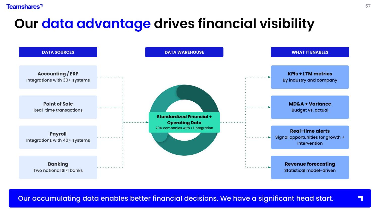 57 Our data advantage drives financial visibility KPIs + LTM metrics By industry and company DATA SOURCES Accounting / ERP Integrations with 30+ systems Point of Sale Real - time transactions Payroll Integrations with 40+ systems Banking Two national SIFI banks Standardized Financial + Operating Data 70% companies with >1 integration MD&A + Variance Budget vs. actual Real - time alerts Signal opportunities for growth + intervention Revenue forecasting Statistical model - driven Our accumulating data enables better financial decisions. We have a significant head start. DATA WAREHOUSE WHAT IT ENABLES