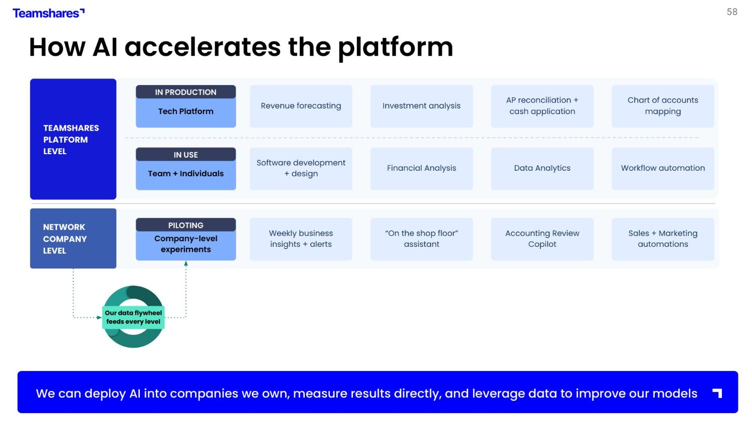 58 How AI accelerates the platform TEAMSHARES PLATFORM LEVEL Revenue forecasting Investment analysis AP reconciliation + cash application Chart of accounts mapping Software development + design Financial Analysis Data Analytics Weekly business insights + alerts “On the shop floor” assistant Accounting Review Copilot We can deploy AI into companies we own, measure results directly, and leverage data to improve our models Tech Platform IN PRODUCTION IN USE Team + Individuals PILOTING Company - level experiments Our data flywheel feeds every level NETWORK COMPANY LEVEL Workflow automation Sales + Marketing automations