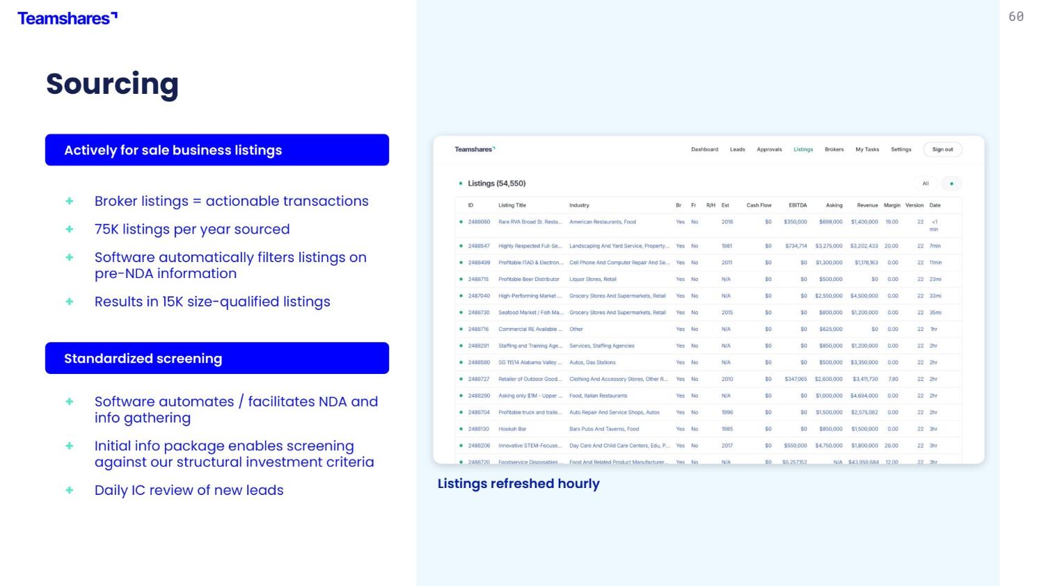 60 + Software automates / facilitates NDA and info gathering + Initial info package enables screening against our structural investment criteria + Daily IC review of new leads Sourcing + Broker listings = actionable transactions + 75K listings per year sourced + Software automatically filters listings on pre - NDA information + Results in 15K size - qualified listings Actively for sale business listings Standardized screening Listings refreshed hourly