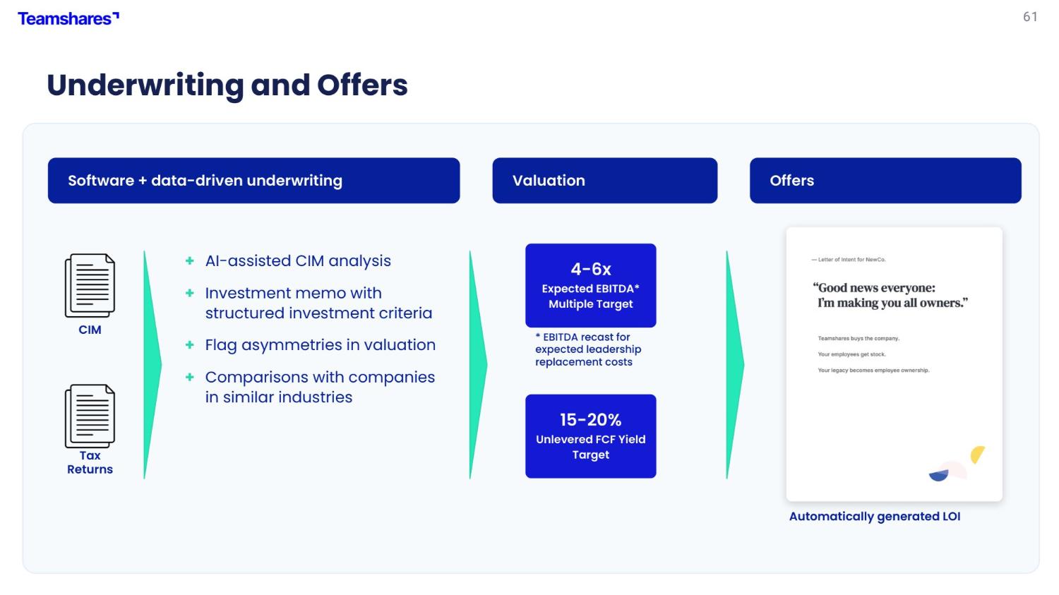 61 Underwriting and Offers Software + data - driven underwriting CIM Tax Returns Valuation 4 - 6x Expected EBITDA* Multiple Target 15 - 20% Unlevered FCF Yield Target * EBITDA recast for expected leadership replacement costs Offers + AI - assisted CIM analysis + Investment memo with structured investment criteria + Flag asymmetries in valuation + Comparisons with companies in similar industries Automatically generated LOI