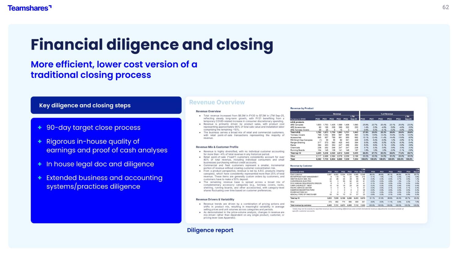 62 Financial diligence and closing Key diligence and closing steps + 90 - day target close process + Rigorous in - house quality of earnings and proof of cash analyses + In house legal doc and diligence + Extended business and accounting systems/practices diligence More efficient, lower cost version of a traditional closing process Diligence report