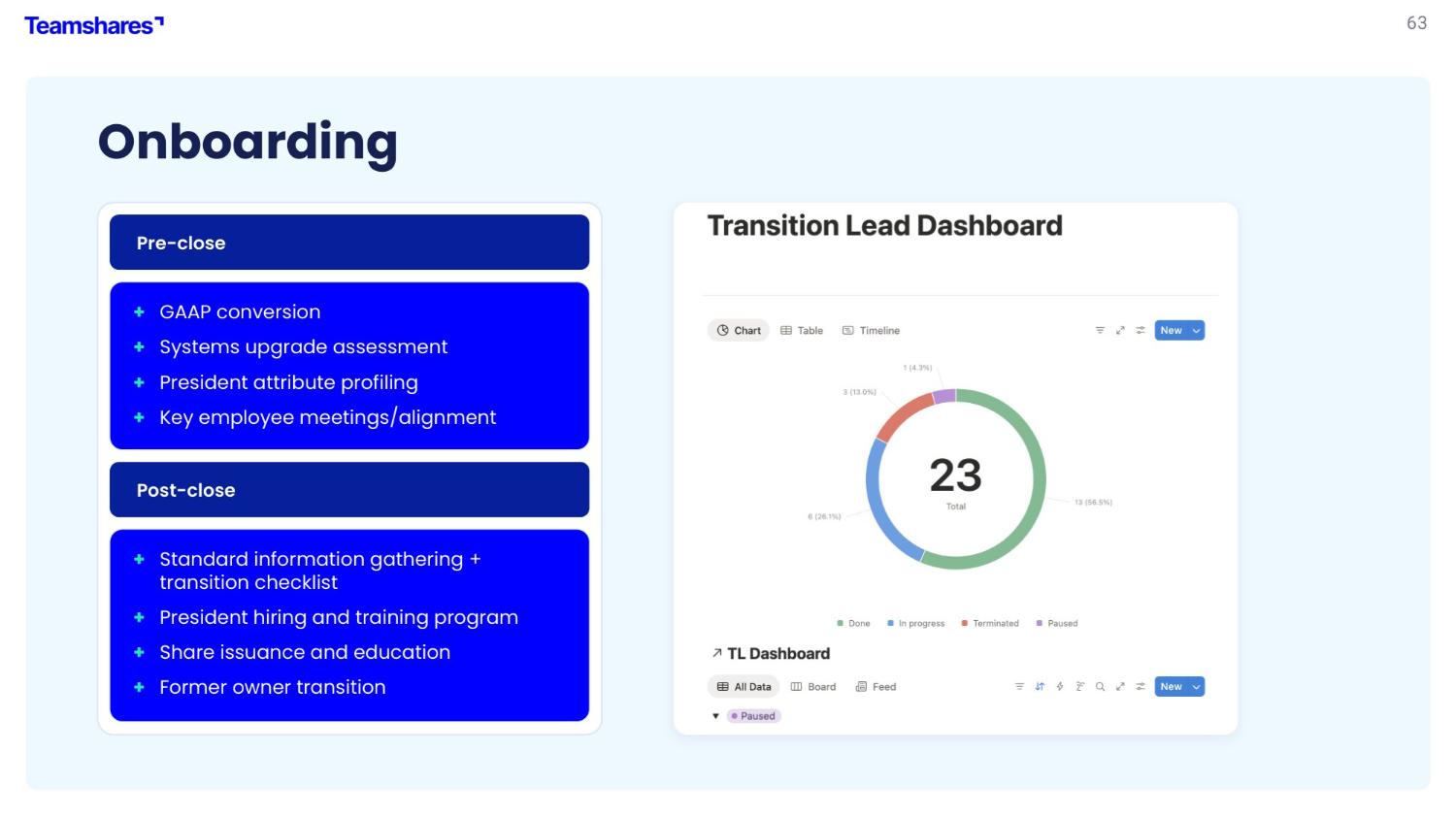 63 Onboarding Pre - close + GAAP conversion + Systems upgrade assessment + President attribute profiling + Key employee meetings/alignment Post - close + Standard information gathering + transition checklist + President hiring and training program + Share issuance and education + Former owner transition