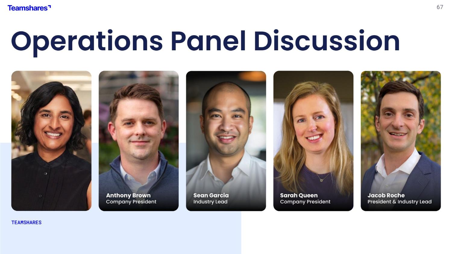67 Operations Panel Discussion Jacob Roche President & Industry Lead TEAMSHARES Madhuri Kommareddi Chief Operating Officer Anthony Brown Company President Sean Garcia Industry Lead Sarah Queen Company President