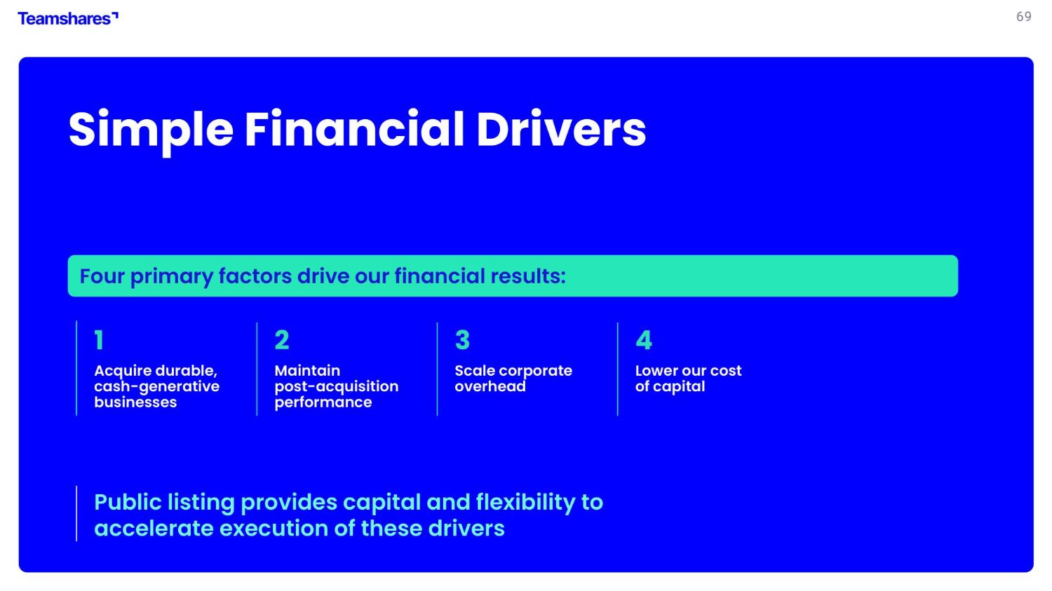 69 Simple Financial Drivers 1 Acquire durable, cash - generative businesses 2 Maintain post - acquisition performance 3 Scale corporate overhead 4 Lower our cost of capital Public listing provides capital and flexibility to accelerate execution of these drivers Four primary factors drive our financial results: