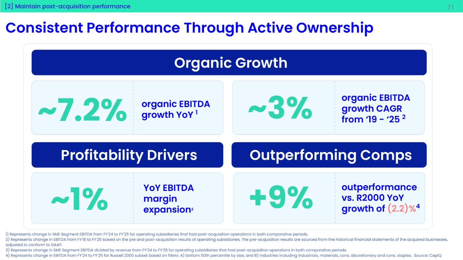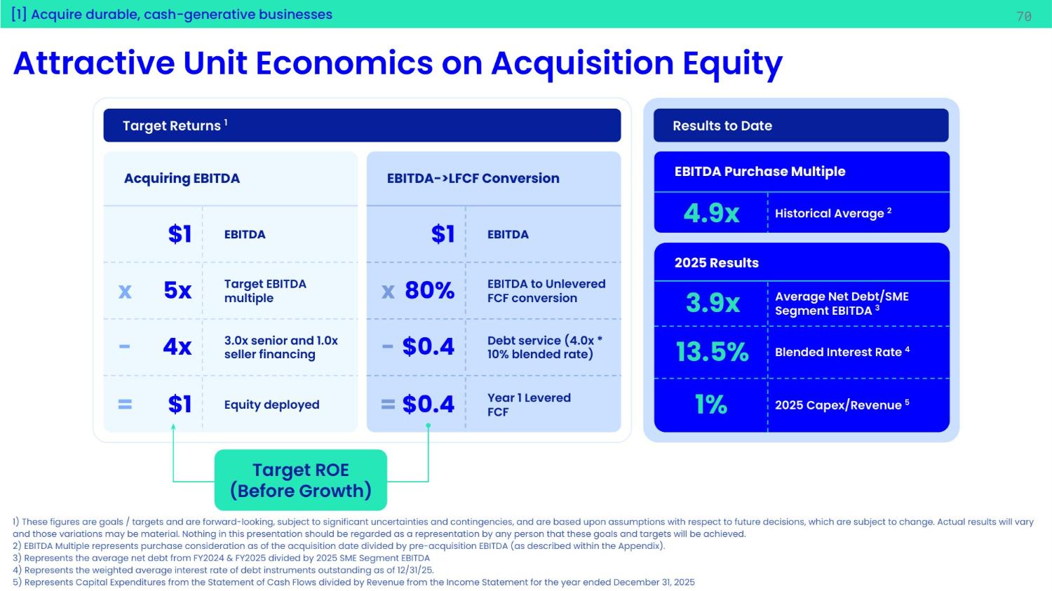 70 1) These figures are goals / targets and are forward - looking, subject to significant uncertainties and contingencies, and are based upon assumptions with respect to future decisions, which are subject to change. Actual results will vary and those variations may be material. Nothing in this presentation should be regarded as a representation by any person that these goals and targets will be achieved. 2) EBITDA Multiple represents purchase consideration as of the acquisition date divided by pre - acquisition EBITDA (as described within the Appendix). 3) Represents the average net debt from FY2024 & FY2025 divided by 2025 SME Segment EBITDA 4) Represents the weighted average interest rate of debt instruments outstanding as of 12/31/25. 5) Represents Capital Expenditures from the Statement of Cash Flows divided by Revenue from the Income Statement for the year ended December 31, 2025 Attractive Unit Economics on Acquisition Equity [1] Acquire durable, cash - generative businesses Results to Date Acquiring EBITDA Target Returns 1 EBITDA $1 Target EBITDA multiple x 5x 3.0x senior and 1.0x seller financing - 4x Equity deployed = $1 EBITDA - >LFCF Conversion EBITDA $1 EBITDA to Unlevered FCF conversion x 80% Debt service (4.0x * 10% blended rate) - $0.4 Year 1 Levered FCF = $0.4 Target ROE (Before Growth) 70 EBITDA Purchase Multiple Historical Average 2 4.9x 2025 Results Average Net Debt/SME Segment EBITDA 3 3.9x Blended Interest Rate 4 13.5% 2025 Capex/Revenue 5 1%