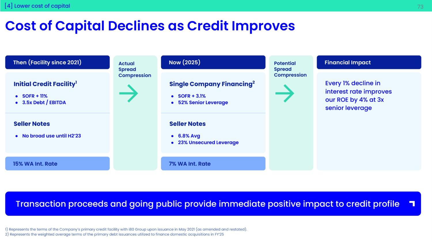 73 Cost of Capital Declines as Credit Improves [4] Lower cost of capital Transaction proceeds and going public provide immediate positive impact to credit profile Initial Credit Facility 1 ● SOFR + 11% ● 3.5x Debt / EBITDA Then (Facility since 2021) Seller Notes ● No broad use until H2’23 15% WA Int. Rate Actual Spread Compression Single Company Financing 2 ● SOFR + 3.1% ● 52% Senior Leverage Now (2025) Seller Notes ● 6.8% Avg ● 23% Unsecured Leverage 7% WA Int. Rate Potential Spread Compression Every 1% decline in interest rate improves our ROE by 4% at 3x senior leverage Financial Impact 73 1) Represents the terms of the Company’s primary credit facility with i80 Group upon issuance in May 2021 (as amended and restated). 2) Represents the weighted average terms of the primary debt issuances utilized to finance domestic acquisitions in FY’25