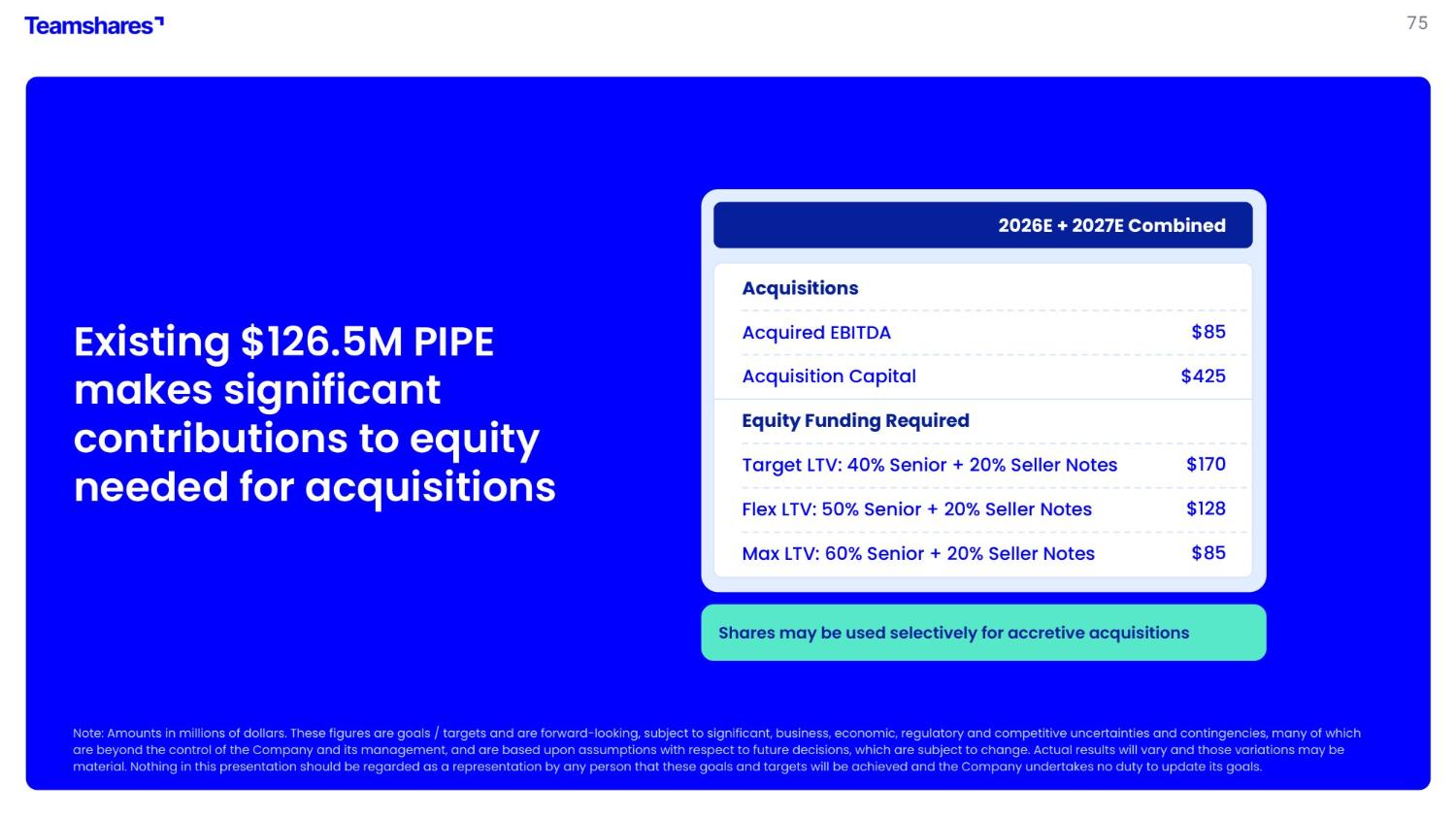 75 Existing $126.5M PIPE makes significant contributions to equity needed for acquisitions Note: Amounts in millions of dollars. These figures are goals / targets and are forward - looking, subject to significant, business, economic, regulatory and competitive uncertainties and contingencies, many of which are beyond the control of the Company and its management, and are based upon assumptions with respect to future decisions, which are subject to change. Actual results will vary and those variations may be material. Nothing in this presentation should be regarded as a representation by any person that these goals and targets will be achieved and the Company undertakes no duty to update its goals. Acquisitions Acquired EBITDA Acquisition Capital Equity Funding Required Target LTV: 40% Senior + 20% Seller Notes Flex LTV: 50% Senior + 20% Seller Notes Max LTV: 60% Senior + 20% Seller Notes 2026E + 2027E Combined Shares may be used selectively for accretive acquisitions $85 $425 $170 $128 $85