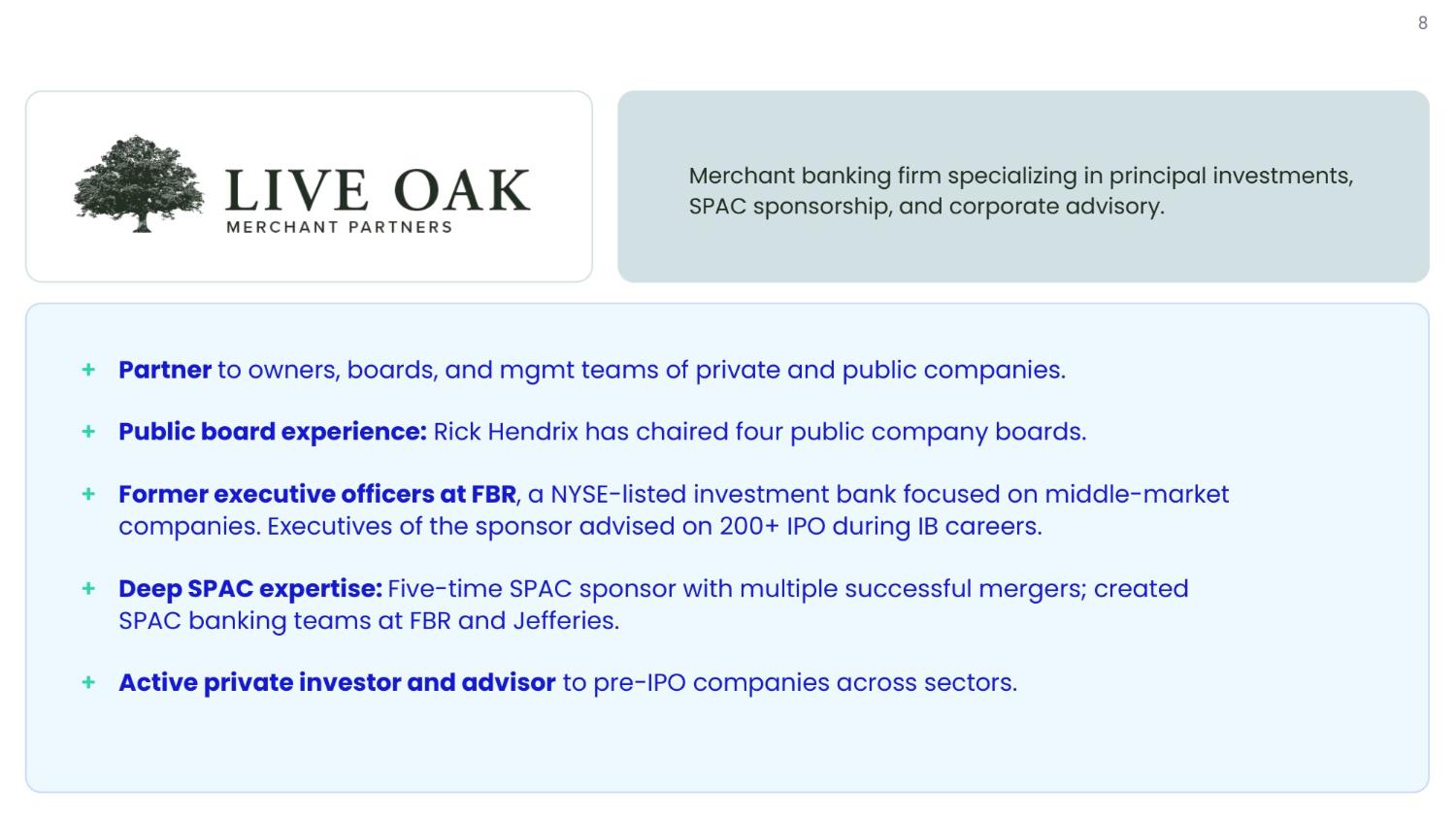 8 Merchant banking firm specializing in principal investments, SPAC sponsorship, and corporate advisory. + Partner to owners, boards, and mgmt teams of private and public companies. + Public board experience: Rick Hendrix has chaired four public company boards. + Former executive officers at FBR , a NYSE - listed investment bank focused on middle - market companies. Executives of the sponsor advised on 200+ IPO during IB careers. + Deep SPAC expertise: Five - time SPAC sponsor with multiple successful mergers; created SPAC banking teams at FBR and Jefferies. + Active private investor and advisor to pre - IPO companies across sectors.