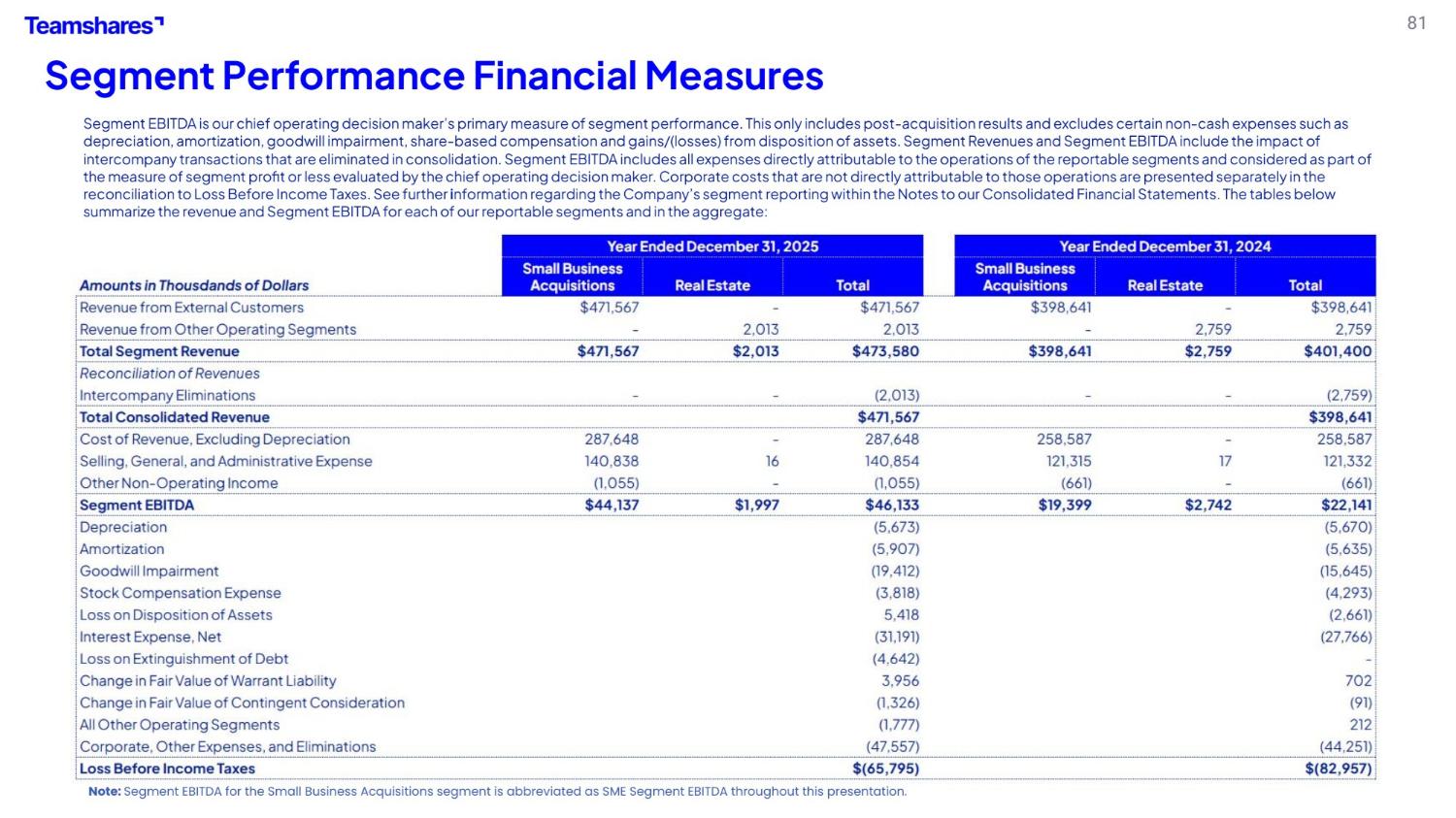 81 Segment Performance Financial Measures Segment EBITDA is our chief operating decision maker’s primary measure of segment performance. This only includes post - acquisition results and excludes certain non - cash expenses such as depreciation, amortization, goodwill impairment, share - based compensation and gains/(losses) from disposition of assets. Segment Revenues and Segment EBITDA include the impact of intercompany transactions that are eliminated in consolidation. Segment EBITDA includes all expenses directly attributable to the operations of the reportable segments and considered as part of the measure of segment profit or less evaluated by the chief operating decision maker. Corporate costs that are not directly attributable to those operations are presented separately in the reconciliation to Loss Before Income Taxes. See further i nformation regarding the Company’s segment reporting within the Notes to our Consolidated Financial Statements. The tables below summarize the revenue and Segment EBITDA for each of our reportable segments and in the aggregate: Note: Segment EBITDA for the Small Business Acquisitions segment is abbreviated as SME Segment EBITDA throughout this presentation.
