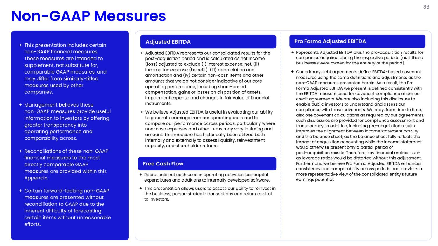 83 Adjusted EBITDA + Adjusted EBITDA represents our consolidated results for the post - acquisition period and is calculated as net income (loss) adjusted to exclude (i) interest expense, net, (ii) income tax expense (benefit), (iii) depreciation and amortization and (iv) certain non - cash items and other amounts that we do not consider indicative of our core operating performance, including share - based compensation, gains or losses on disposition of assets, impairment expense and changes in fair value of financial instruments. + We believe Adjusted EBITDA is useful in evaluating our ability to generate earnings from our operating base and to compare our performance across periods, particularly where non - cash expenses and other items may vary in timing and amount. This measure has historically been utilized both internally and externally to assess liquidity, reinvestment capacity, and shareholder returns. Non - GAAP Measures + This presentation includes certain non - GAAP financial measures. These measures are intended to supplement, not substitute for, comparable GAAP measures, and may differ from similarly - titled measures used by other companies. + Management believes these non - GAAP measures provide useful information to investors by offering greater transparency into operating performance and comparability across. + Reconciliations of these non - GAAP financial measures to the most directly comparable GAAP measures are provided within this Appendix. + Certain forward - looking non - GAAP measures are presented without reconciliation to GAAP due to the inherent difficulty of forecasting certain items without unreasonable efforts. Pro Forma Adjusted EBITDA + Represents Adjusted EBITDA plus the pre - acquisition results for companies acquired during the respective periods (as if these businesses were owned for the entirety of the period) . + Our primary debt agreements define EBITDA - based covenant measures using the same definitions and adjustments as the non - GAAP measures presented herein. As a result, the Pro Forma Adjusted EBITDA we present is defined consistently with the EBITDA measure used for covenant compliance under our credit agreements. We are also including this disclosure to enable public investors to understand and assess our compliance with those covenants. We may, from time to time, disclose covenant calculations as required by our agreements; such disclosures are provided for compliance assessment and transparency. In addition, including pre - acquisition results improves the alignment between income statement activity and the balance sheet, as the balance sheet fully reflects the impact of acquisition accounting while the income statement would otherwise present only a partial period of post - acquisition results. Therefore, key financial metrics such as leverage ratios would be distorted without this adjustment. Furthermore, we believe Pro Forma Adjusted EBITDA enhances consistency and comparability across periods and provides a more representative view of the consolidated entity’s future earnings potential. Free Cash Flow + Represents net cash used in operating activities less capital expenditures and additions to internally developed software. + This presentation allows users to assess our ability to reinvest in the business, pursue strategic transactions and return capital to investors.