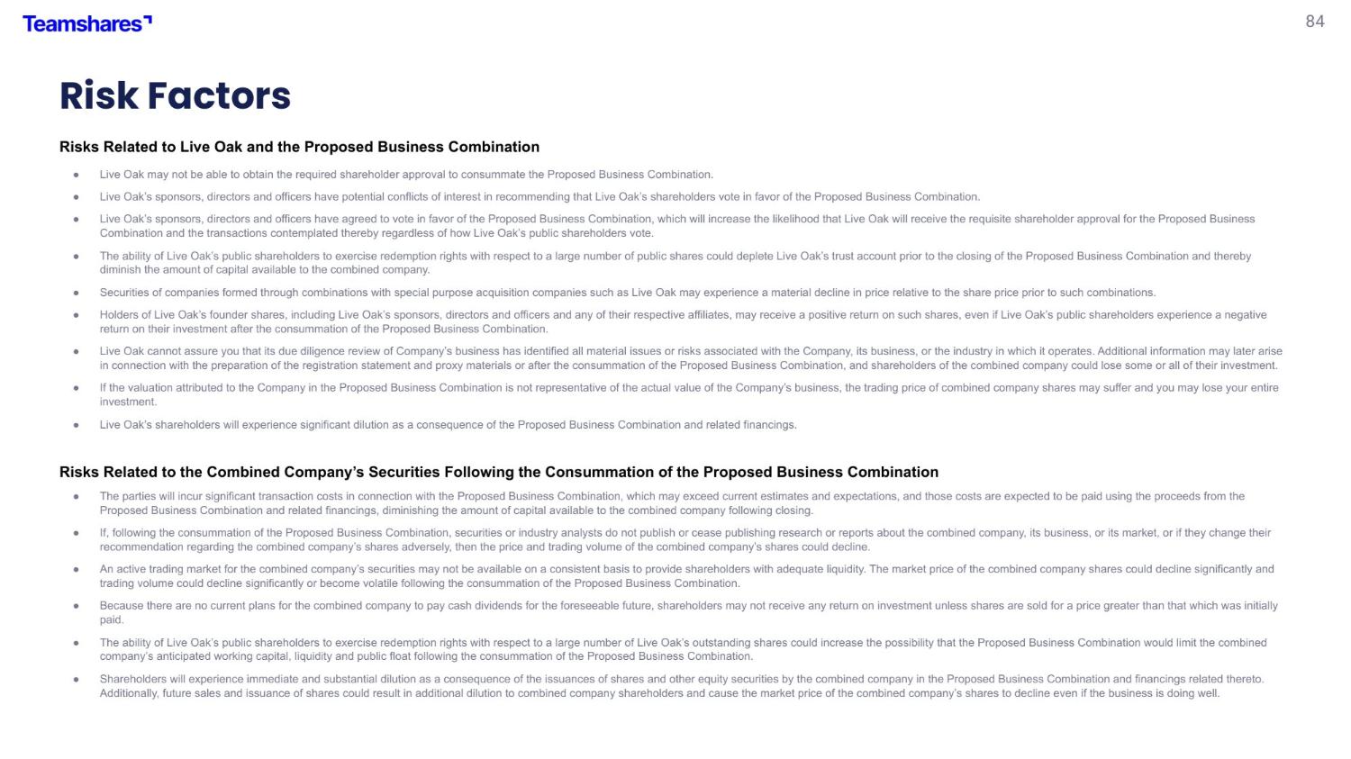84 Risk Factors Risks Related to Live Oak and the Proposed Business Combination ● Live Oak may not be able to obtain the required shareholder approval to consummate the Proposed Business Combination. ● Live Oak’s sponsors, directors and officers have potential conflicts of interest in recommending that Live Oak’s shareholders vote in favor of the Proposed Business Combination. ● Live Oak’s sponsors, directors and officers have agreed to vote in favor of the Proposed Business Combination, which will increase the likelihood that Live Oak will receive the requisite shareholder approval for the Proposed Business Combination and the transactions contemplated thereby regardless of how Live Oak’s public shareholders vote. ● The ability of Live Oak’s public shareholders to exercise redemption rights with respect to a large number of public shares could deplete Live Oak’s trust account prior to the closing of the Proposed Business Combination and thereby diminish the amount of capital available to the combined company. ● Securities of companies formed through combinations with special purpose acquisition companies such as Live Oak may experience a material decline in price relative to the share price prior to such combinations. ● Holders of Live Oak’s founder shares, including Live Oak’s sponsors, directors and officers and any of their respective affiliates, may receive a positive return on such shares, even if Live Oak’s public shareholders experience a negative return on their investment after the consummation of the Proposed Business Combination. ● Live Oak cannot assure you that its due diligence review of Company’s business has identified all material issues or risks associated with the Company, its business, or the industry in which it operates. Additional information may later arise in connection with the preparation of the registration statement and proxy materials or after the consummation of the Proposed Business Combination, and shareholders of the combined company could lose some or all of their investment. ● If the valuation attributed to the Company in the Proposed Business Combination is not representative of the actual value of the Company’s business, the trading price of combined company shares may suffer and you may lose your entire investment. ● Live Oak’s shareholders will experience significant dilution as a consequence of the Proposed Business Combination and related financings. Risks Related to the Combined Company’s Securities Following the Consummation of the Proposed Business Combination ● The parties will incur significant transaction costs in connection with the Proposed Business Combination, which may exceed current estimates and expectations, and those costs are expected to be paid using the proceeds from the Proposed Business Combination and related financings, diminishing the amount of capital available to the combined company following closing. ● If, following the consummation of the Proposed Business Combination, securities or industry analysts do not publish or cease publishing research or reports about the combined company, its business, or its market, or if they change their recommendation regarding the combined company’s shares adversely, then the price and trading volume of the combined company’s shares could decline. ● An active trading market for the combined company’s securities may not be available on a consistent basis to provide shareholders with adequate liquidity. The market price of the combined company shares could decline significantly and trading volume could decline significantly or become volatile following the consummation of the Proposed Business Combination. ● Because there are no current plans for the combined company to pay cash dividends for the foreseeable future, shareholders may not receive any return on investment unless shares are sold for a price greater than that which was initially paid. ● The ability of Live Oak’s public shareholders to exercise redemption rights with respect to a large number of Live Oak’s outstanding shares could increase the possibility that the Proposed Business Combination would limit the combined company’s anticipated working capital, liquidity and public float following the consummation of the Proposed Business Combination. ● Shareholders will experience immediate and substantial dilution as a consequence of the issuances of shares and other equity securities by the combined company in the Proposed Business Combination and financings related thereto. Additionally, future sales and issuance of shares could result in additional dilution to combined company shareholders and cause the market price of the combined company’s shares to decline even if the business is doing well.