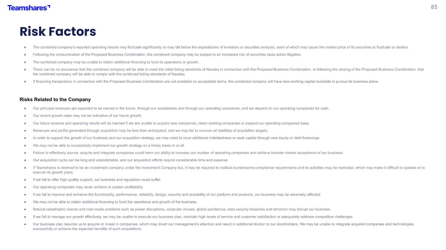 85 Risk Factors ● The combined company’s reported operating results may fluctuate significantly or may fall below the expectations of investors or securities analysts, each of which may cause the market price of its securities to fluctuate or decline. ● Following the consummation of the Proposed Business Combination, the combined company may be subject to an increased risk of securities class action litigation. ● The combined company may be unable to obtain additional financing to fund its operations or growth. ● There can be no assurance that the combined company will be able to meet the initial listing standards of Nasdaq in connection with the Proposed Business Combination, or following the closing of the Proposed Business Combination, that the combined company will be able to comply with the continued listing standards of Nasdaq. ● If financing transactions in connection with the Proposed Business Combination are not available on acceptable terms, the combined company will have less working capital available to pursue its business plans. Risks Related to the Company ● Our principal revenues are expected to be earned in the future, through our subsidiaries and through our operating companies, and we depend on our operating companies for cash. ● Our recent growth rates may not be indicative of our future growth. ● Our future revenue and operating results will be harmed if we are unable to acquire new companies, retain existing companies or expand our operating companies base. ● Revenues and profits generated through acquisition may be less than anticipated, and we may fail to uncover all liabilities of acquisition targets. ● In order to support the growth of our business and our acquisition strategy, we may need to incur additional indebtedness or seek capital through new equity or debt financings. ● We may not be able to successfully implement our growth strategy on a timely basis or at all. ● Failure to effectively source, acquire and integrate companies could harm our ability to increase our number of operating companies and achieve broader market acceptance of our business. ● Our acquisition cycle can be long and unpredictable, and our acquisition efforts require considerable time and expense. ● If Teamshares is deemed to be an investment company under the Investment Company Act, it may be required to institute burdensome compliance requirements and its activities may be restricted, which may make it difficult to operate or to execute its growth plans. ● If we fail to offer high quality support, our business and reputation could suffer. ● Our operating companies may never achieve or sustain profitability. ● If we fail to improve and enhance the functionality, performance, reliability, design, security and scalability of our platform and products, our business may be adversely affected. ● We may not be able to obtain additional financing to fund the operations and growth of the business. ● Natural catastrophic events and man - made problems such as power disruptions, computer viruses, global pandemics, data security breaches and terrorism may disrupt our business. ● If we fail to manage our growth effectively, we may be unable to execute our business plan, maintain high levels of service and customer satisfaction or adequately address competitive challenges. ● Our business plan requires us to acquire or invest in companies, which may divert our management’s attention and result in additional dilution to our stockholders. We may be unable to integrate acquired companies and technologies successfully or achieve the expected benefits of such acquisitions.
