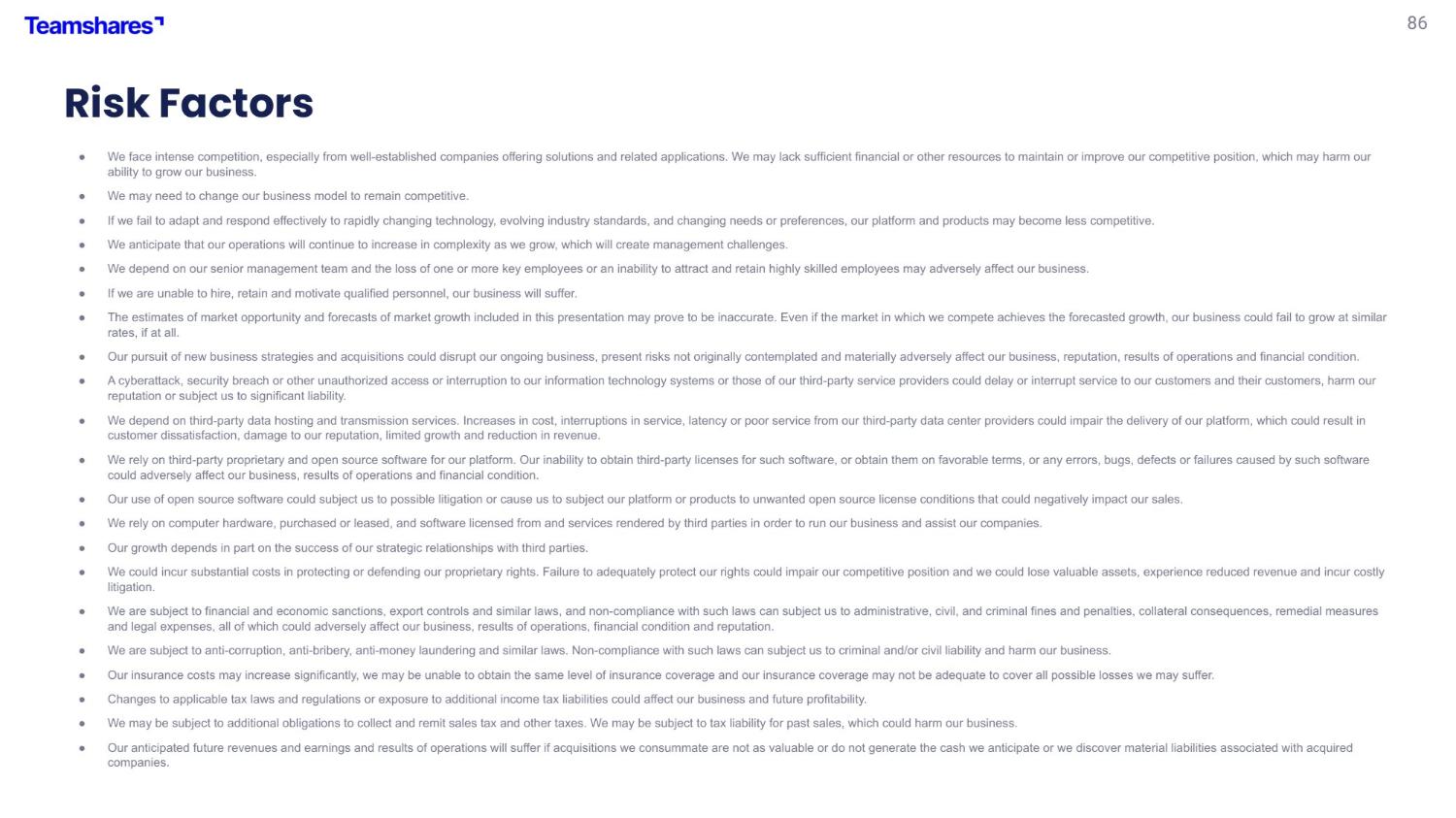 86 ● We face intense competition, especially from well - established companies offering solutions and related applications. We may lack sufficient financial or other resources to maintain or improve our competitive position, which may harm our ability to grow our business. ● We may need to change our business model to remain competitive. ● If we fail to adapt and respond effectively to rapidly changing technology, evolving industry standards, and changing needs or preferences, our platform and products may become less competitive. ● We anticipate that our operations will continue to increase in complexity as we grow, which will create management challenges. ● We depend on our senior management team and the loss of one or more key employees or an inability to attract and retain highly skilled employees may adversely affect our business. ● If we are unable to hire, retain and motivate qualified personnel, our business will suffer. ● The estimates of market opportunity and forecasts of market growth included in this presentation may prove to be inaccurate. Even if the market in which we compete achieves the forecasted growth, our business could fail to grow at similar rates, if at all. ● Our pursuit of new business strategies and acquisitions could disrupt our ongoing business, present risks not originally contemplated and materially adversely affect our business, reputation, results of operations and financial condition. ● A cyberattack, security breach or other unauthorized access or interruption to our information technology systems or those of our third - party service providers could delay or interrupt service to our customers and their customers, harm our reputation or subject us to significant liability. ● We depend on third - party data hosting and transmission services. Increases in cost, interruptions in service, latency or poor service from our third - party data center providers could impair the delivery of our platform, which could result in customer dissatisfaction, damage to our reputation, limited growth and reduction in revenue. ● We rely on third - party proprietary and open source software for our platform. Our inability to obtain third - party licenses for such software, or obtain them on favorable terms, or any errors, bugs, defects or failures caused by such software could adversely affect our business, results of operations and financial condition. ● Our use of open source software could subject us to possible litigation or cause us to subject our platform or products to unwanted open source license conditions that could negatively impact our sales. ● We rely on computer hardware, purchased or leased, and software licensed from and services rendered by third parties in order to run our business and assist our companies. ● Our growth depends in part on the success of our strategic relationships with third parties. ● We could incur substantial costs in protecting or defending our proprietary rights. Failure to adequately protect our rights could impair our competitive position and we could lose valuable assets, experience reduced revenue and incur costly litigation. ● We are subject to financial and economic sanctions, export controls and similar laws, and non - compliance with such laws can subject us to administrative, civil, and criminal fines and penalties, collateral consequences, remedial measures and legal expenses, all of which could adversely affect our business, results of operations, financial condition and reputation. ● We are subject to anti - corruption, anti - bribery, anti - money laundering and similar laws. Non - compliance with such laws can subject us to criminal and/or civil liability and harm our business. ● Our insurance costs may increase significantly, we may be unable to obtain the same level of insurance coverage and our insurance coverage may not be adequate to cover all possible losses we may suffer. ● Changes to applicable tax laws and regulations or exposure to additional income tax liabilities could affect our business and future profitability. ● We may be subject to additional obligations to collect and remit sales tax and other taxes. We may be subject to tax liability for past sales, which could harm our business. ● Our anticipated future revenues and earnings and results of operations will suffer if acquisitions we consummate are not as valuable or do not generate the cash we anticipate or we discover material liabilities associated with acquired companies. Risk Factors