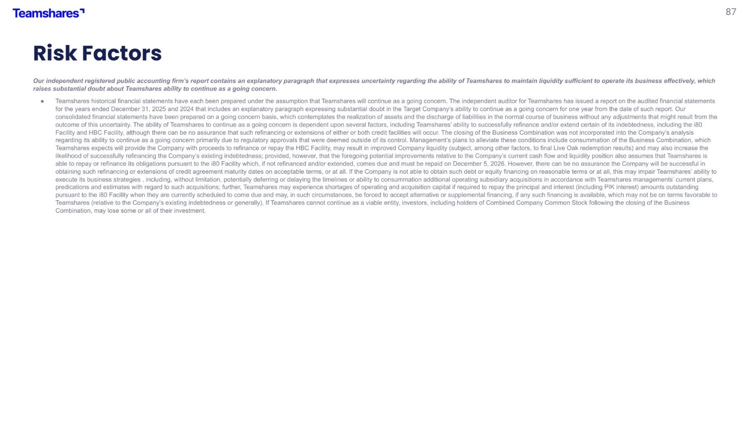 87 Risk Factors Our independent registered public accounting firm’s report contains an explanatory paragraph that expresses uncertainty regarding the ability of Teamshares to maintain liquidity sufficient to operate its business effectively, which raises substantial doubt about Teamshares ability to continue as a going concern. ● Teamshares historical financial statements have each been prepared under the assumption that Teamshares will continue as a going concern. The independent auditor for Teamshares has issued a report on the audited financial statements for the years ended December 31, 2025 and 2024 that includes an explanatory paragraph expressing substantial doubt in the Target Company’s ability to continue as a going concern for one year from the date of such report. Our consolidated financial statements have been prepared on a going concern basis, which contemplates the realization of assets and the discharge of liabilities in the normal course of business without any adjustments that might result from the outcome of this uncertainty. The ability of Teamshares to continue as a going concern is dependent upon several factors, including Teamshares’ ability to successfully refinance and/or extend certain of its indebtedness, including the i80 Facility and HBC Facility, although there can be no assurance that such refinancing or extensions of either or both credit facilities will occur. The closing of the Business Combination was not incorporated into the Company’s analysis regarding its ability to continue as a going concern primarily due to regulatory approvals that were deemed outside of its control. Management’s plans to alleviate these conditions include consummation of the Business Combination, which Teamshares expects will provide the Company with proceeds to refinance or repay the HBC Facility, may result in improved Company liquidity (subject, among other factors, to final Live Oak redemption results) and may also increase the likelihood of successfully refinancing the Company’s existing indebtedness; provided, however, that the foregoing potential improvements relative to the Company’s current cash flow and liquidity position also assumes that Teamshares is able to repay or refinance its obligations pursuant to the i80 Facility which, if not refinanced and/or extended, comes due and must be repaid on December 5, 2026. However, there can be no assurance the Company will be successful in obtaining such refinancing or extensions of credit agreement maturity dates on acceptable terms, or at all. If the Company is not able to obtain such debt or equity financing on reasonable terms or at all, this may impair Teamshares’ ability to execute its business strategies , including, without limitation, potentially deferring or delaying the timelines or ability to consummation additional operating subsidiary acquisitions in accordance with Teamshares managements’ current plans, predications and estimates with regard to such acquisitions; further, Teamshares may experience shortages of operating and acquisition capital if required to repay the principal and interest (including PIK interest) amounts outstanding pursuant to the i80 Facility when they are currently scheduled to come due and may, in such circumstances, be forced to accept alternative or supplemental financing, if any such financing is available, which may not be on terms favorable to Teamshares (relative to the Company’s existing indebtedness or generally). If Teamshares cannot continue as a viable entity, investors, including holders of Combined Company Common Stock following the closing of the Business Combination, may lose some or all of their investment.