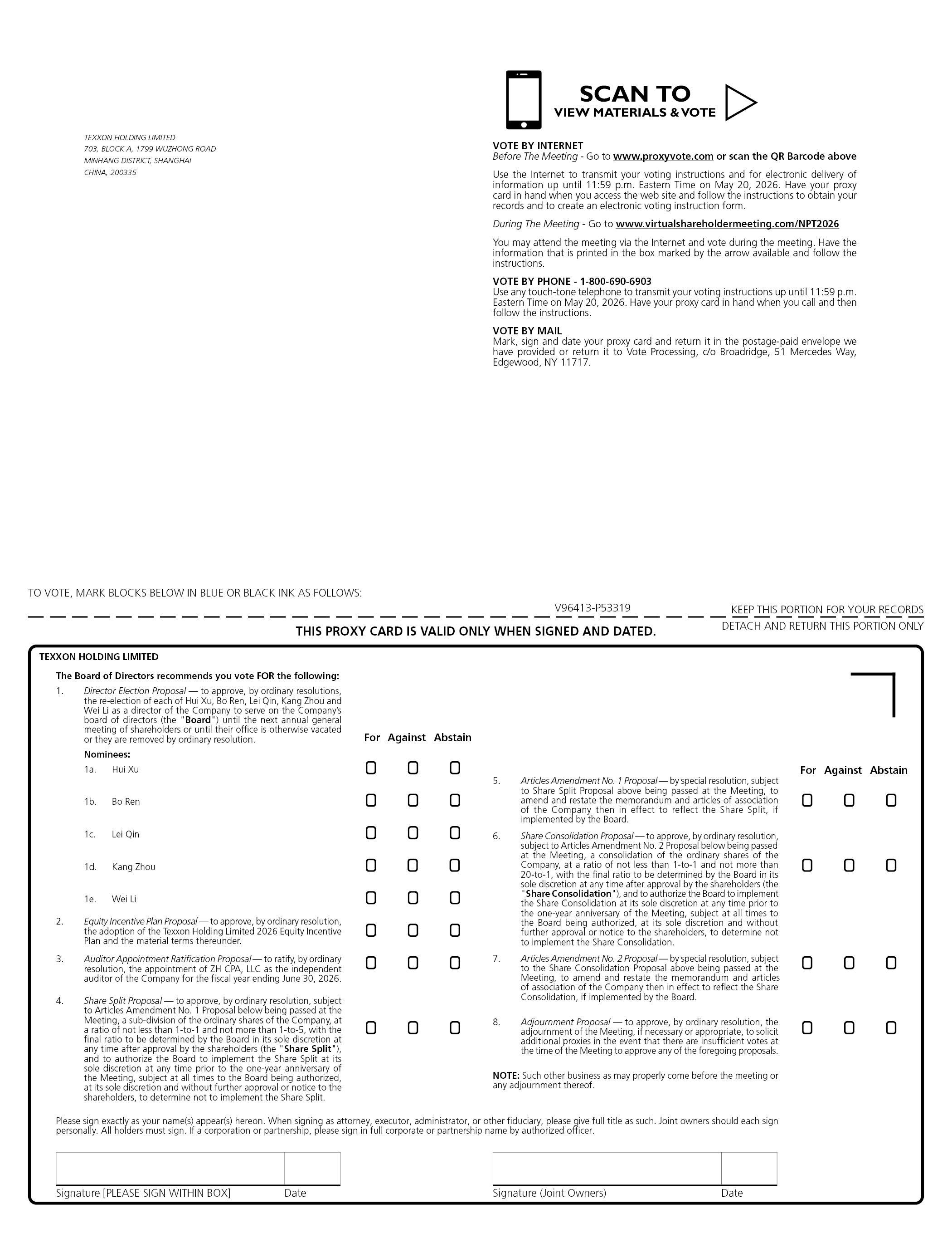 TEXXON HOLDING LIMITED 703, BLOCK A, 1799 WUZHONG ROAD MINHANG DISTRICT, SHANGHAI CHINA, 200335 SCAN TO VIEW MATERIALS & VOTE VOTE BY INTERNET Before The Meeting - Go to www.proxyvote.com or scan the QR Barcode above Use the Internet to transmit your voting instructions and for electronic delivery of information up until 11:59 p.m. Eastern Time on May 20, 2026. Have your proxy card in hand when you access the web site and follow the instructions to obtain your records and to create an electronic voting instruction form. During The Meeting - Go to www.virtualshareholdermeeting.com/NPT2026 You may attend the meeting via the Internet and vote during the meeting. Have the information that is printed in the box marked by the arrow available and follow the instructions. VOTE BY PHONE - 1-800-690-6903 Use any touch-tone telephone to transmit your voting instructions up until 11:59 p.m. Eastern Time on May 20, 2026. Have your proxy card in hand when you call and then follow the instructions. VOTE BY MAIL Mark, sign and date your proxy card and return it in the postage-paid envelope we have provided or return it to Vote Processing, c/o Broadridge, 51 Mercedes Way, Edgewood, NY 11717. TO VOTE, MARK BLOCKS BELOW IN BLUE OR BLACK INK AS FOLLOWS: V96413-P53319 KEEP THIS PORTION FOR YOUR RECORDS DETACH AND RETURN THIS PORTION ONLY THIS PROXY CARD IS VALID ONLY WHEN SIGNED AND DATED. TEXXON HOLDING LIMITED The Board of Directors recommends you vote FOR the following: 1. Director Election Proposal — to approve, by ordinary resolutions, the re-election of each of Hui Xu, Bo Ren, Lei Qin, Kang Zhou and Wei Li as a director of the Company to serve on the Company’s board of directors (the “Board”) until the next annual general meeting of shareholders or until their office is otherwise vacated or they are removed by ordinary resolution. Nominees: 1a. Hui Xu 1b. Bo Ren 1c. Lei Qin 1d. Kang Zhou 1e. Wei Li 2. Equity Incentive Plan Proposal — to approve, by ordinary resolution, the adoption of the Texxon Holding Limited 2026 Equity Incentive Plan and the material terms thereunder. 3. Auditor Appointment Ratification Proposal — to ratify, by ordinary resolution, the appointment of ZH CPA, LLC as the independent auditor of the Company for the fiscal year ending June 30, 2026. 4. Share Split Proposal — to approve, by ordinary resolution, subject to Articles Amendment No. 1 Proposal below being passed at the Meeting, a sub-division of the ordinary shares of the Company, at a ratio of not less than 1-to-1 and not more than 1-to-5, with the final ratio to be determined by the Board in its sole discretion at any time after approval by the shareholders (the “Share Split”), and to authorize the Board to implement the Share Split at its sole discretion at any time prior to the one-year anniversary of the Meeting, subject at all times to the Board being authorized, at its sole discretion and without further approval or notice to the shareholders, to determine not to implement the Share Split. Please sign exactly as your name(s) appear(s) hereon. When signing as attorney, executor, administrator, or other fiduciary, please give full title as such. Joint owners should each sign personally. All holders must sign. If a corporation or partnership, please sign in full corporate or partnership name by authorized officer. 5. Articles Amendment No. 1 Proposal — by special resolution, subject to Share Split Proposal above being passed at the Meeting, to amend and restate the memorandum and articles of association of the Company then in effect to reflect the Share Split, if implemented by the Board. 6. Share Consolidation Proposal — to approve, by ordinary resolution, subject to Articles Amendment No. 2 Proposal below being passed at the Meeting, a consolidation of the ordinary shares of the Company, at a ratio of not less than 1-to-1 and not more than 20-to-1, with the final ratio to be determined by the Board in its sole discretion at any time after approval by the shareholders (the “Share Consolidation”), and to authorize the Board to implement the Share Consolidation at its sole discretion at any time prior to the one-year anniversary of the Meeting, subject at all times to the Board being authorized, at its sole discretion and without further approval or notice to the shareholders, to determine not to implement the Share Consolidation. 7. Articles Amendment No. 2 Proposal — by special resolution, subject to the Share Consolidation Proposal above being passed at the Meeting, to amend and restate the memorandum and articles of association of the Company then in effect to reflect the Share Consolidation, if implemented by the Board. 8. Adjournment Proposal — to approve, by ordinary resolution, the adjournment of the Meeting, if necessary or appropriate, to solicit additional proxies in the event that there are insufficient votes at the time of the Meeting to approve any of the foregoing proposals. NOTE: Such other business as may properly come before the meeting or any adjournment thereof. For Against Abstain Signature [PLEASE SIGN WITHIN BOX] Date Signature (Joint Owners) Date