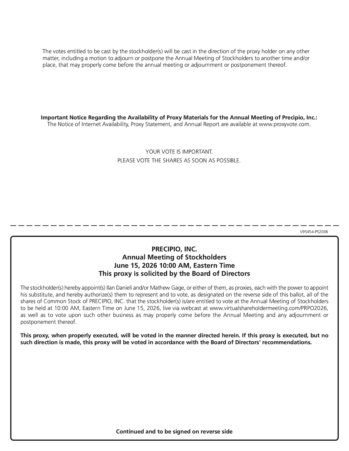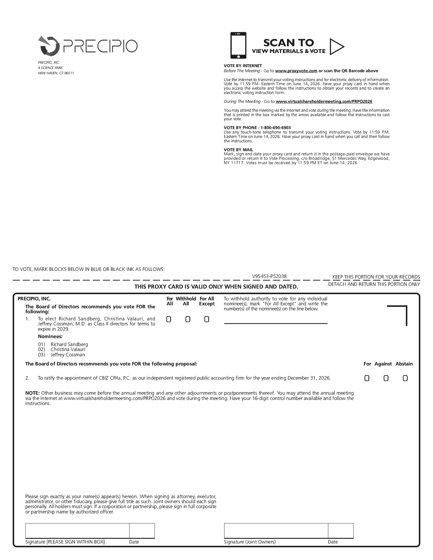 Time has been allocated on the agenda to respond to questions submitted during the Annual Meeting. Questions we do not answer during the Annual Meeting will be answered in writing and posted on the Company’s website at www.precipiodx.com/investors.html. Please refer to the Annual Meeting Rules of Conduct and Procedures for more information on how to ask questions. The Rules of Conduct and Procedures are available at www.proxyvote.com and during the Annual Meeting at www.virtualshareholdermeeting.com/PRPO2026.