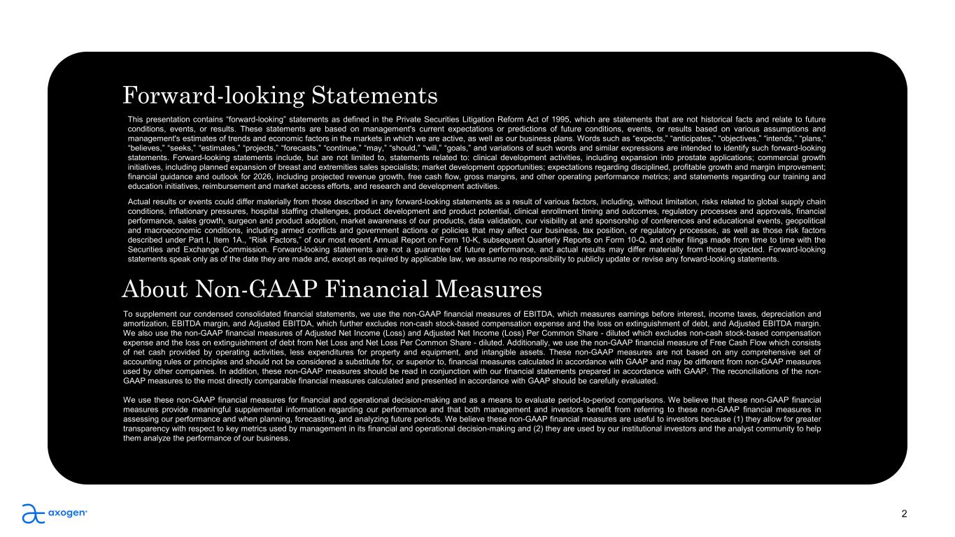 Forward-looking Statements This presentation contains “forward-looking” statements as defined in the Private Securities Litigation Reform Act of 1995, which are statements that are not historical facts and relate to future conditions, events, or results. These statements are based on management's current expectations or predictions of future conditions, events, or results based on various assumptions and management's estimates of trends and economic factors in the markets in which we are active, as well as our business plans. Words such as “expects,” “anticipates,” “objectives,” “intends,” “plans,” “believes,” “seeks,” “estimates,” “projects,” “forecasts,” “continue,” “may,” “should,” “will,” “goals,” and variations of such words and similar expressions are intended to identify such forward-looking statements. Forward-looking statements include, but are not limited to, statements related to: clinical development activities, including expansion into prostate applications; commercial growth initiatives, including planned expansion of breast and extremities sales specialists; market development opportunities; expectations regarding disciplined, profitable growth and margin improvement; financial guidance and outlook for 2026, including projected revenue growth, free cash flow, gross margins, and other operating performance metrics; and statements regarding our training and education initiatives, reimbursement and market access efforts, and research and development activities. Actual results or events could differ materially from those described in any forward-looking statements as a result of various factors, including, without limitation, risks related to global supply chain conditions, inflationary pressures, hospital staffing challenges, product development and product potential, clinical enrollment timing and outcomes, regulatory processes and approvals, financial performance, sales growth, surgeon and product adoption, market awareness of our products, data validation, our visibility at and sponsorship of conferences and educational events, geopolitical and macroeconomic conditions, including armed conflicts and government actions or policies that may affect our business, tax position, or regulatory processes, as well as those risk factors described under Part I, Item 1A., “Risk Factors,” of our most recent Annual Report on Form 10-K, subsequent Quarterly Reports on Form 10-Q, and other filings made from time to time with the Securities and Exchange Commission. Forward-looking statements are not a guarantee of future performance, and actual results may differ materially from those projected. Forward-looking statements speak only as of the date they are made and, except as required by applicable law, we assume no responsibility to publicly update or revise any forward-looking statements. 2 About Non-GAAP Financial Measures To supplement our condensed consolidated financial statements, we use the non-GAAP financial measures of EBITDA, which measures earnings before interest, income taxes, depreciation and amortization, EBITDA margin, and Adjusted EBITDA, which further excludes non-cash stock-based compensation expense and the loss on extinguishment of debt, and Adjusted EBITDA margin. We also use the non-GAAP financial measures of Adjusted Net Income (Loss) and Adjusted Net Income (Loss) Per Common Share - diluted which excludes non-cash stock-based compensation expense and the loss on extinguishment of debt from Net Loss and Net Loss Per Common Share - diluted. Additionally, we use the non-GAAP financial measure of Free Cash Flow which consists of net cash provided by operating activities, less expenditures for property and equipment, and intangible assets. These non-GAAP measures are not based on any comprehensive set of accounting rules or principles and should not be considered a substitute for, or superior to, financial measures calculated in accordance with GAAP and may be different from non-GAAP measures used by other companies. In addition, these non-GAAP measures should be read in conjunction with our financial statements prepared in accordance with GAAP. The reconciliations of the non- GAAP measures to the most directly comparable financial measures calculated and presented in accordance with GAAP should be carefully evaluated. We use these non-GAAP financial measures for financial and operational decision-making and as a means to evaluate period-to-period comparisons. We believe that these non-GAAP financial measures provide meaningful supplemental information regarding our performance and that both management and investors benefit from referring to these non-GAAP financial measures in assessing our performance and when planning, forecasting, and analyzing future periods. We believe these non-GAAP financial measures are useful to investors because (1) they allow for greater transparency with respect to key metrics used by management in its financial and operational decision-making and (2) they are used by our institutional investors and the analyst community to help them analyze the performance of our business.