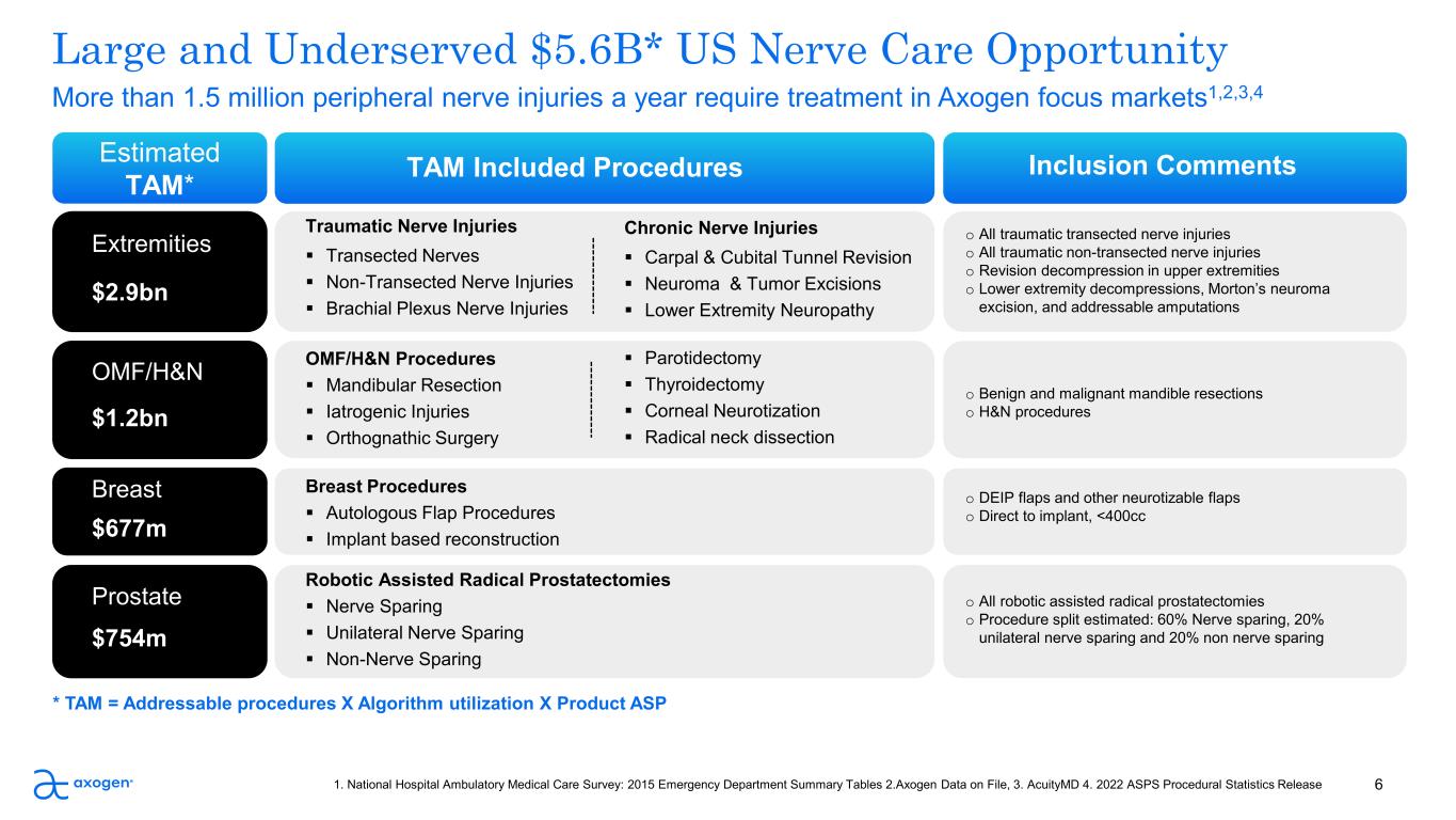 Large and Underserved $5.6B* US Nerve Care Opportunity 6 Traumatic Nerve Injuries  Transected Nerves  Non-Transected Nerve Injuries  Brachial Plexus Nerve Injuries Breast Procedures  Autologous Flap Procedures  Implant based reconstruction Robotic Assisted Radical Prostatectomies  Nerve Sparing  Unilateral Nerve Sparing  Non-Nerve Sparing Extremities $2.9bn Estimated TAM* OMF/H&N $1.2bn Breast $677m Prostate $754m TAM Included Procedures Chronic Nerve Injuries  Carpal & Cubital Tunnel Revision  Neuroma & Tumor Excisions  Lower Extremity Neuropathy OMF/H&N Procedures  Mandibular Resection  Iatrogenic Injuries  Orthognathic Surgery  Parotidectomy  Thyroidectomy  Corneal Neurotization  Radical neck dissection 1. National Hospital Ambulatory Medical Care Survey: 2015 Emergency Department Summary Tables 2.Axogen Data on File, 3. AcuityMD 4. 2022 ASPS Procedural Statistics Release Inclusion Comments o All traumatic transected nerve injuries o All traumatic non-transected nerve injuries o Revision decompression in upper extremities o Lower extremity decompressions, Morton’s neuroma excision, and addressable amputations o Benign and malignant mandible resections o H&N procedures * TAM = Addressable procedures X Algorithm utilization X Product ASP o DEIP flaps and other neurotizable flaps o Direct to implant, <400cc o All robotic assisted radical prostatectomies o Procedure split estimated: 60% Nerve sparing, 20% unilateral nerve sparing and 20% non nerve sparing More than 1.5 million peripheral nerve injuries a year require treatment in Axogen focus markets1,2,3,4