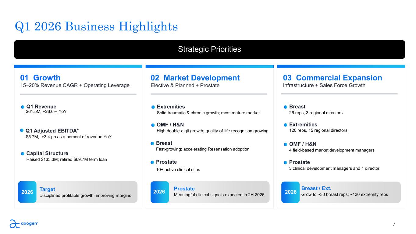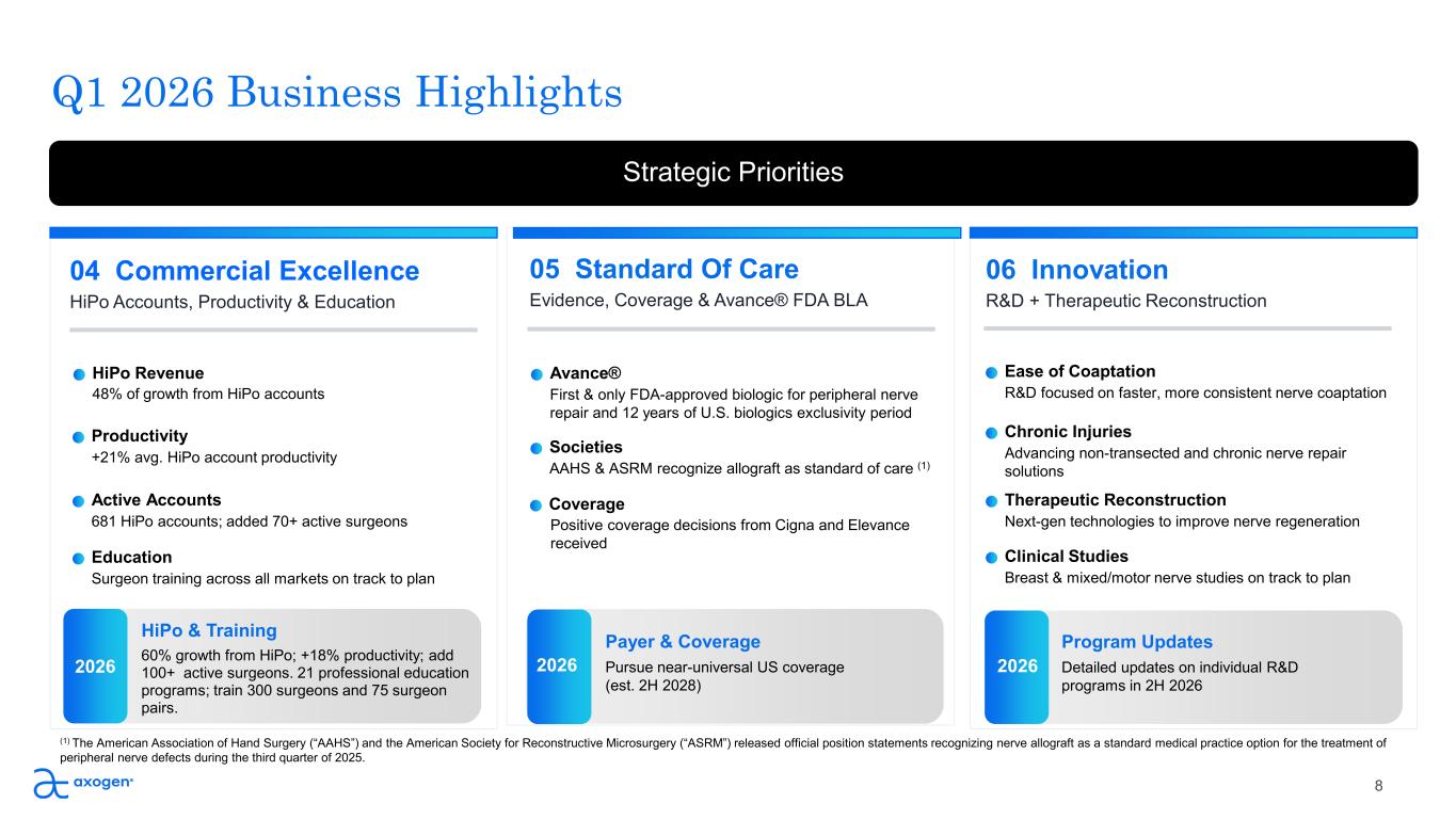 7 Strategic Priorities Q1 2026 Business Highlights 01 Growth 15–20% Revenue CAGR + Operating Leverage Q1 Revenue $61.5M, +26.6% YoY Capital Structure Raised $133.3M; retired $69.7M term loan 2026 Target Disciplined profitable growth; improving margins 02 Market Development Elective & Planned + Prostate Extremities Solid traumatic & chronic growth; most mature market OMF / H&N High double-digit growth; quality-of-life recognition growing Breast Fast-growing; accelerating Resensation adoption Prostate 10+ active clinical sites 2026 Prostate Meaningful clinical signals expected in 2H 2026 03 Commercial Expansion Infrastructure + Sales Force Growth Breast 26 reps, 3 regional directors Extremities 120 reps, 15 regional directors OMF / H&N 4 field-based market development managers Prostate 3 clinical development managers and 1 director 2026 Breast / Ext. Grow to ~30 breast reps; ~130 extremity reps 7 Q1 Adjusted EBITDA* $5.7M, +3.4 pp as a percent of revenue YoY