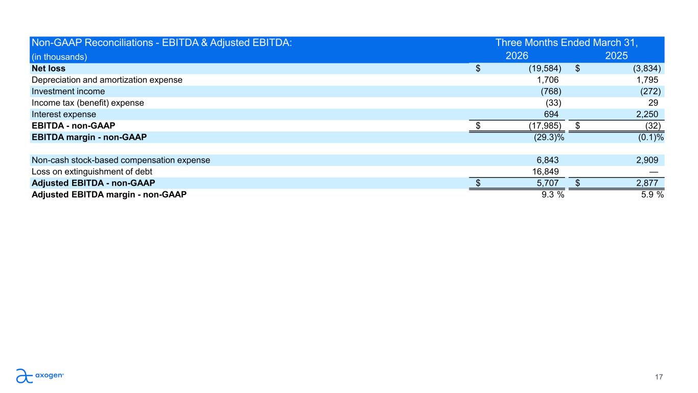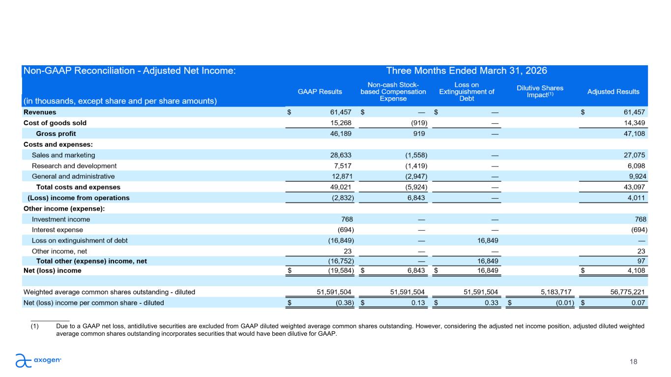 17 Non-GAAP Reconciliations - EBITDA & Adjusted EBITDA: Three Months Ended March 31, (in thousands)​ 2026 2025 Net loss $ (19,584) $ (3,834) Depreciation and amortization expense 1,706 1,795 Investment income (768) (272) Income tax (benefit) expense (33) 29 Interest expense 694 2,250 EBITDA - non-GAAP $ (17,985) $ (32) EBITDA margin - non-GAAP (29.3)% (0.1)% Non-cash stock-based compensation expense 6,843 2,909 Loss on extinguishment of debt 16,849 — Adjusted EBITDA - non-GAAP $ 5,707 $ 2,877 Adjusted EBITDA margin - non-GAAP 9.3 % 5.9 %