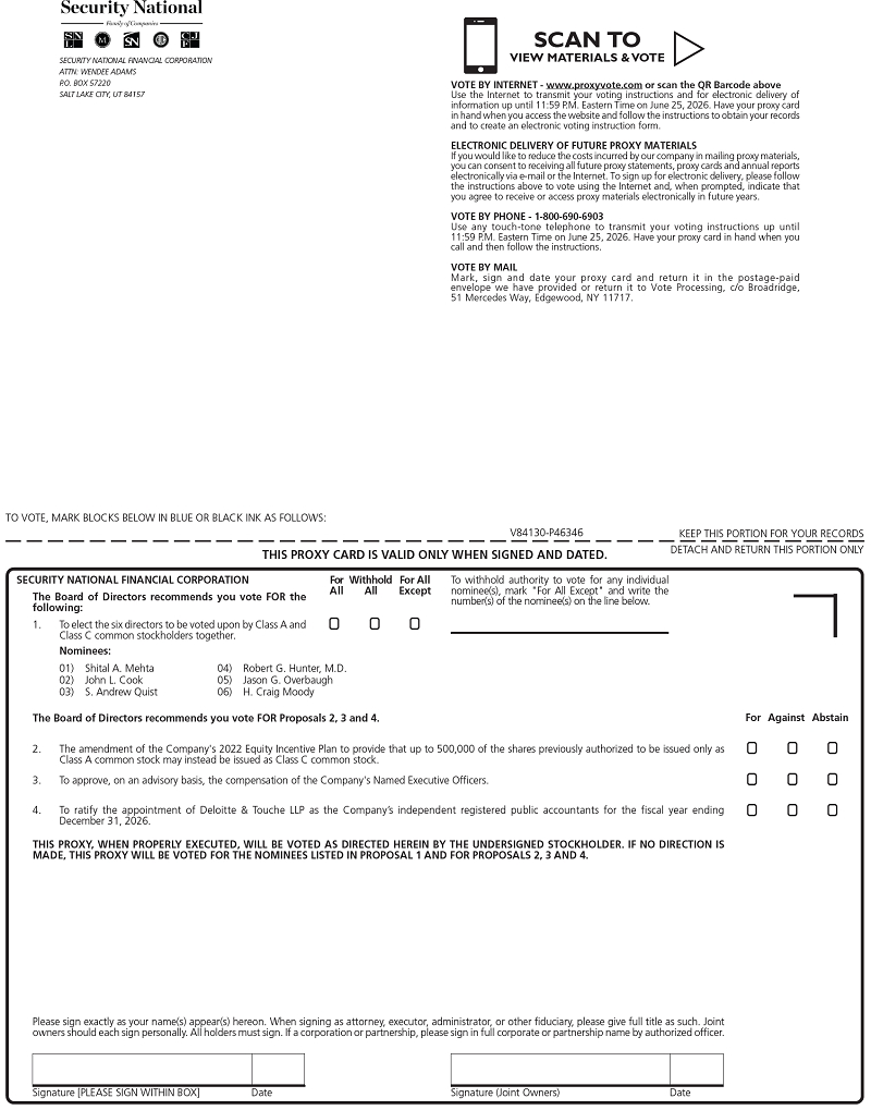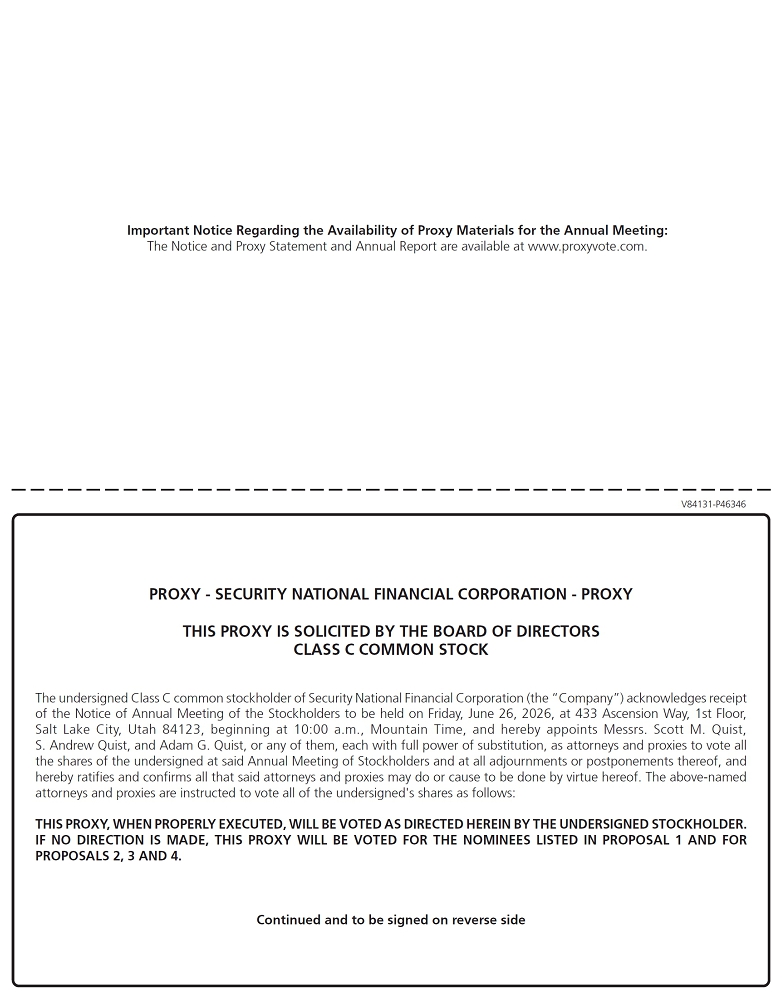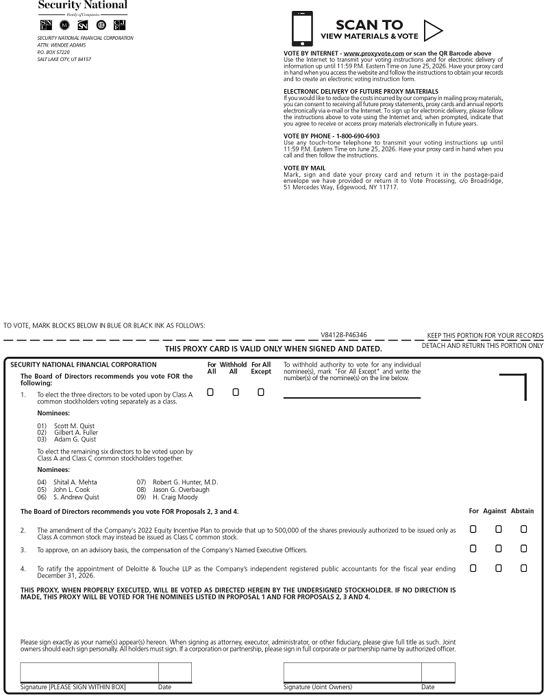 On behalf of the Board of Directors (the “Board”), it is my pleasure to invite you to attend the Annual Meeting of Stockholders (the “Annual Meeting”) of Security National Financial Corporation (the “Company”) to be held on Friday, June 26, 2026, beginning at 10:00 a.m., Mountain Daylight Time, at 433 Ascension Way, 1st Floor, Salt Lake City, Utah 84123. The formal notice of the Annual Meeting and the Proxy Statement have been made a part of this invitation.